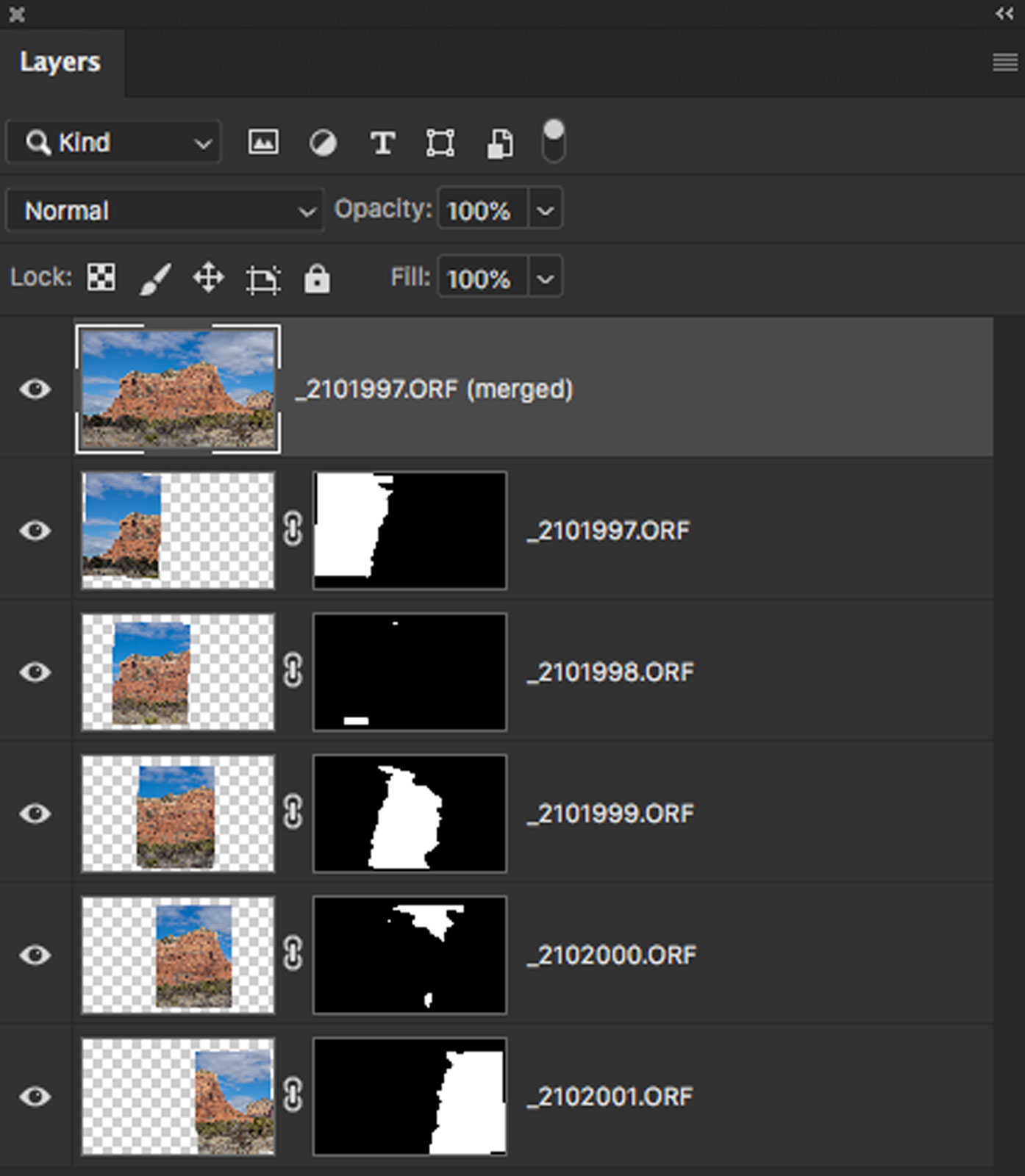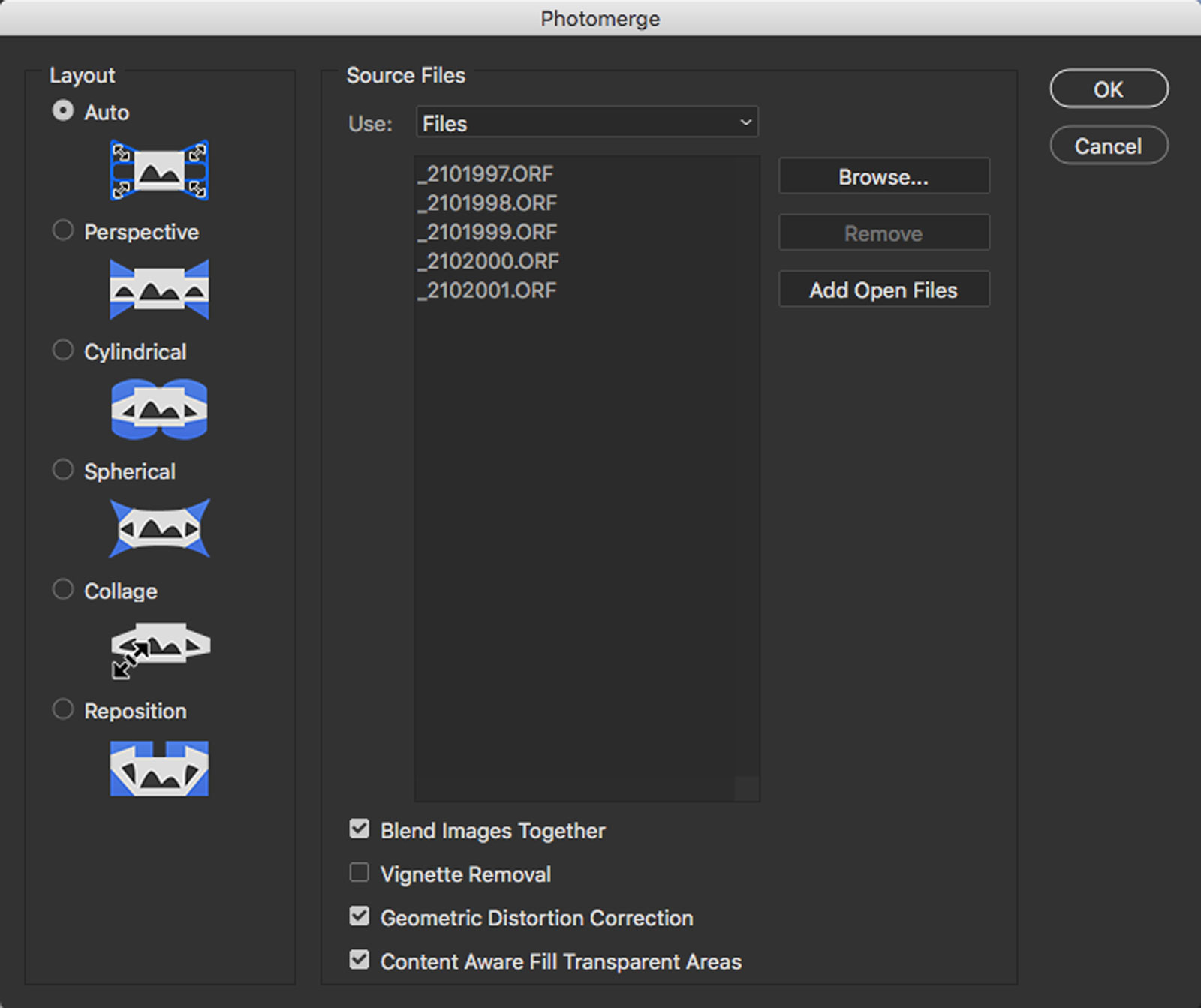 The Photomerge setting in Photoshop does a nice job of blending images. Above you can see the layers and masks created by the software; I set the Photomerge settings as you see them. If your camera is showing a vignette and not blending well, you might want to check the Vignette Removal box.