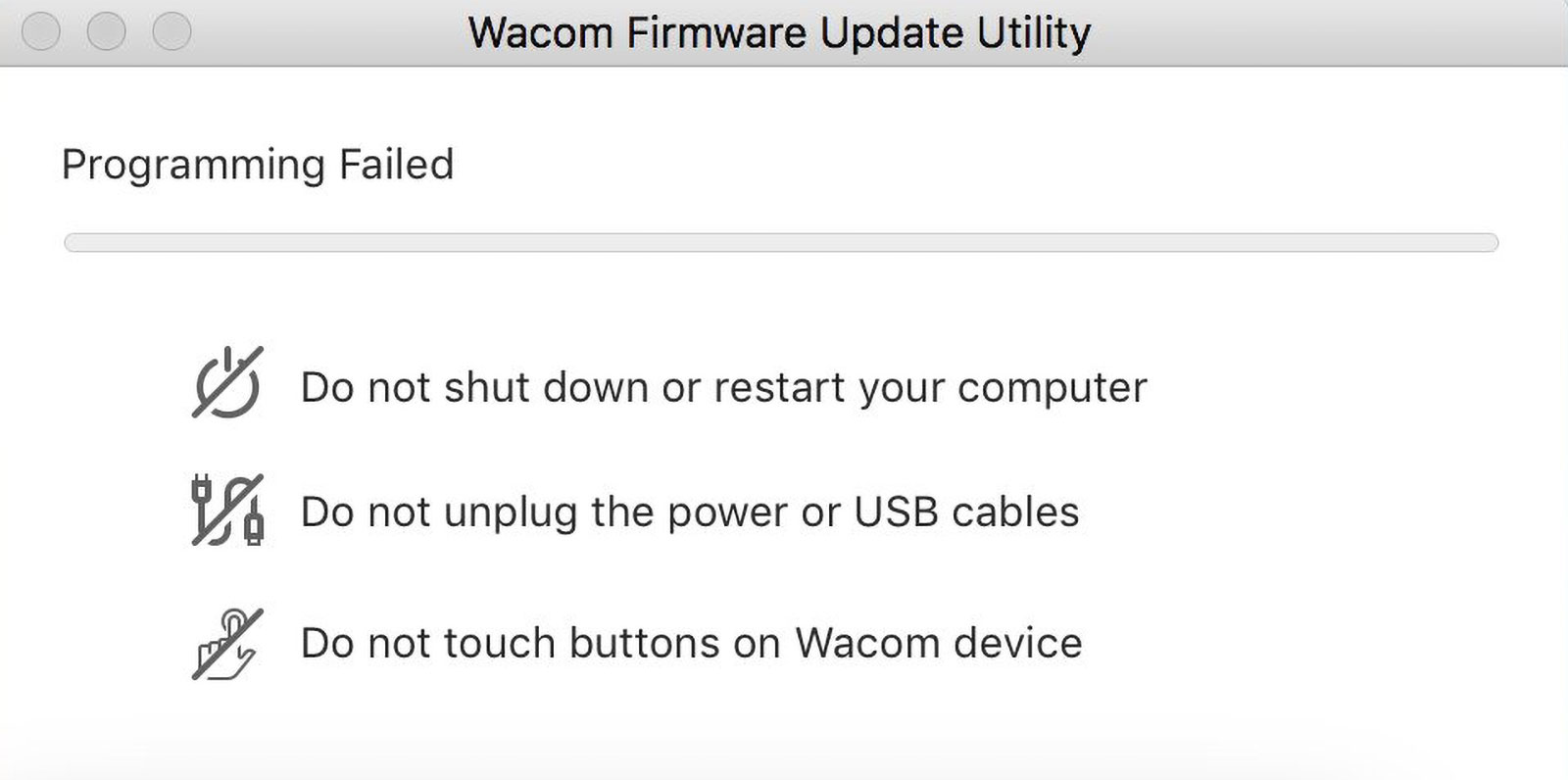 I tried several times without success. I contacted Wacom support who asked me to send the tablet for repair. None of this was necessary with the information you provided. It worked very well and the firmware was easily installed successfully. Thank you very much!