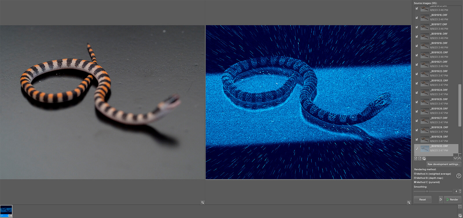 FYI the Ground Snake was about 6 inches long and was in approximately this position when we found it on our driveway. You would think focus stacking would not be necessary. But using a macro lens at a medium aperture made this project work. The E-M1 Mark III has a built in focus stacking system. I set the capture for 55 images and with one push of the shutter they were all captured in RAW format. A pro tip is to place something just in front of your subject to set focus to ensure full focus on the image. Before I started doing that sometimes the front of the subject was just a wee bit soft.