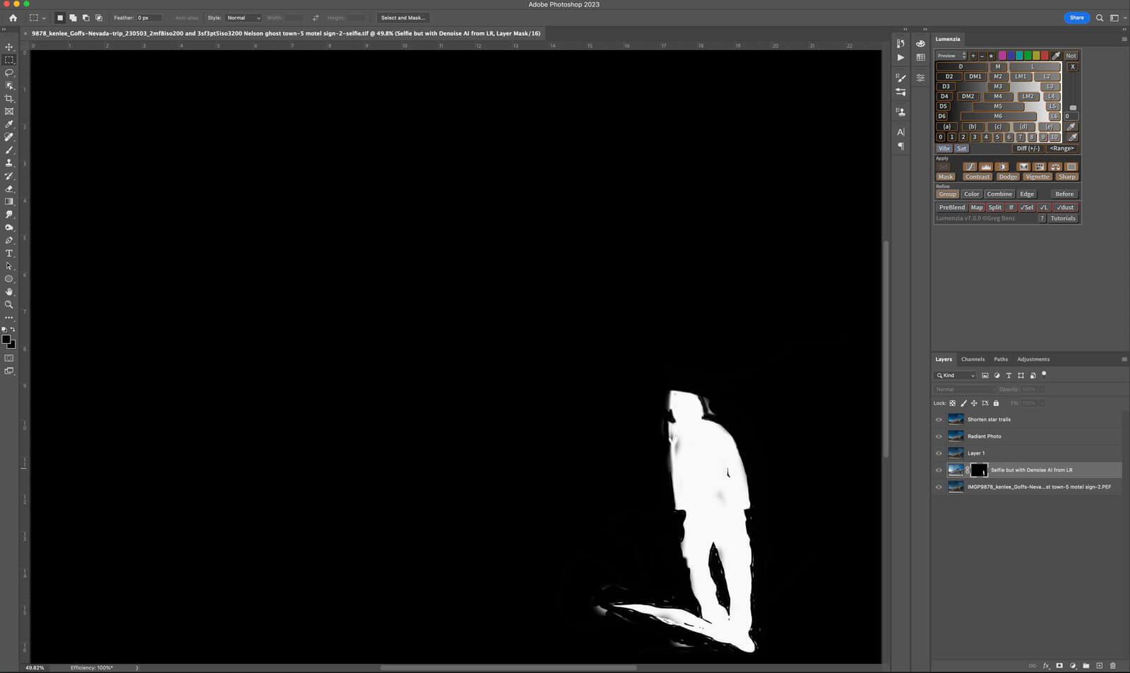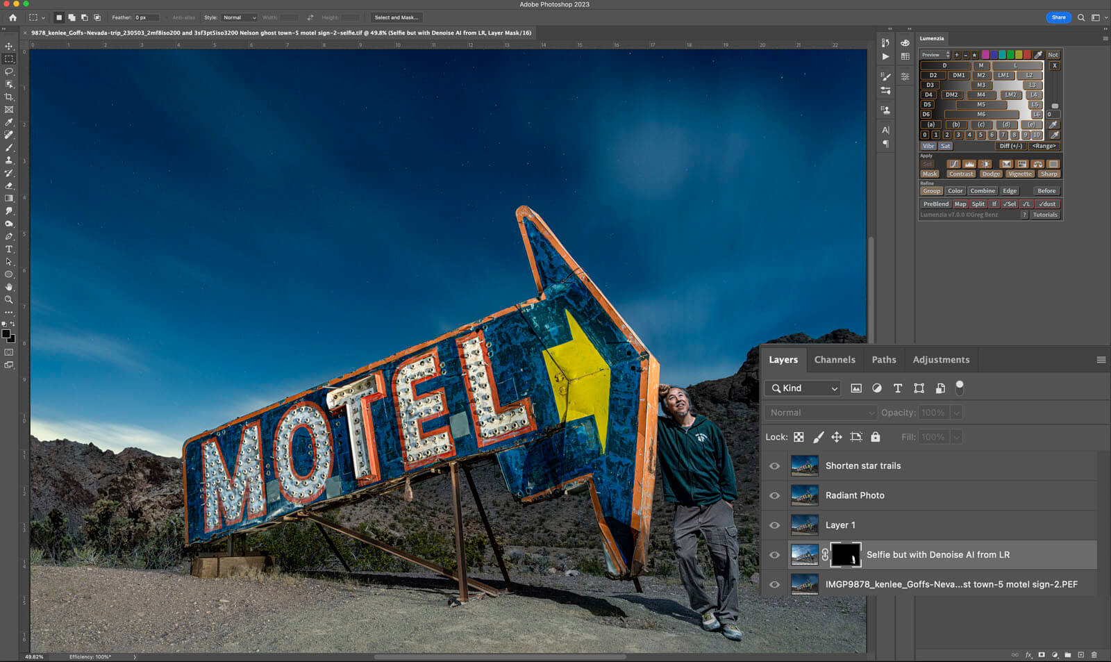 - If you blend a second image with yourself in the photo, try to apply noise reduction to match the first image. You’re trying to make it look like you were actually standing perfectly still for the longer exposure. I used Lightroom Classic Denoise AI to do this before sending it to Photoshop. I could have just as easily used Topaz Labs Denoise AI, which is also very capable.