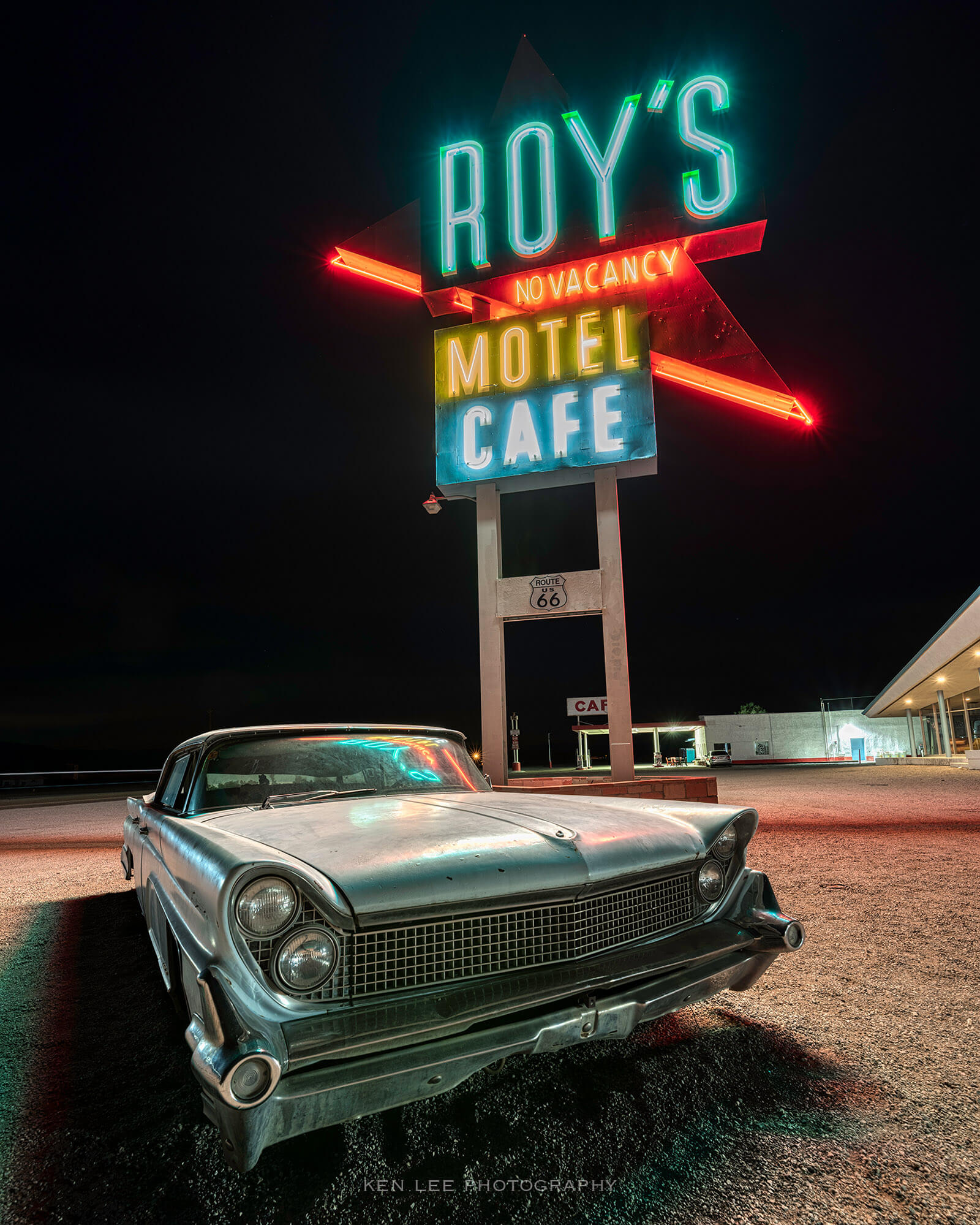 I went on an 8-day, 1,856-mile night photography road trip with several friends. Along the way, we photographed part of historic Route 66. This included the iconic Roy’s Motel and Cafe neon sign at Amboy, CA.