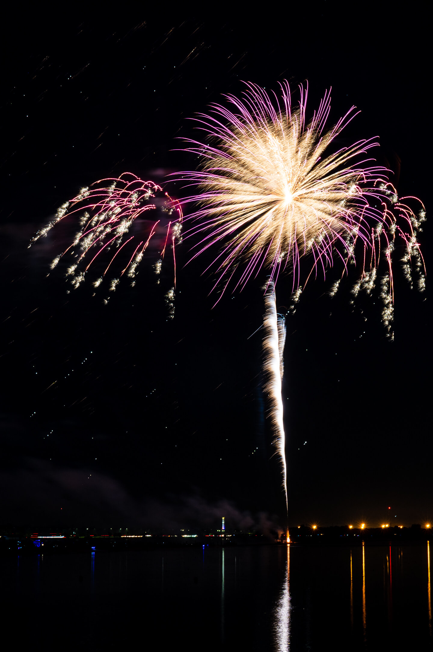 If your background is interesting, try expanding your shutter speed to 5 seconds to capture even more detail behind the fireworks. As the show builds to a finale, with a longer shutter speed you may have too much smoke in the images obscuring some of the fireworks. If this is the case shorten your shutter speed slightly from 4 seconds to 3 or even 2 seconds.