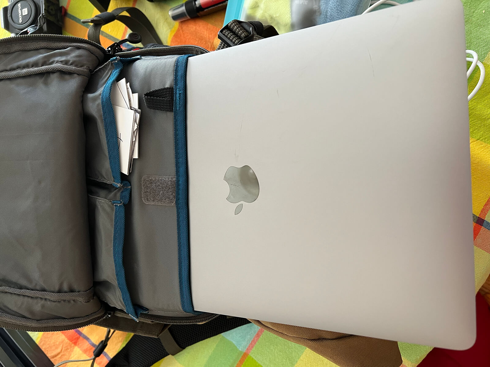 The smaller size forced me to keep my gear in check. The camera compartment rests against your back, making it more difficult to be tampered with when you are in a crowd. It has a compartment for a 13″ laptop or tablet. I was not sure about the roll top but it did work out well for me. I was able to tighten it down once I had items packed. As an aside, the side compartment will fit a full-size tube of Pringles Crisps!