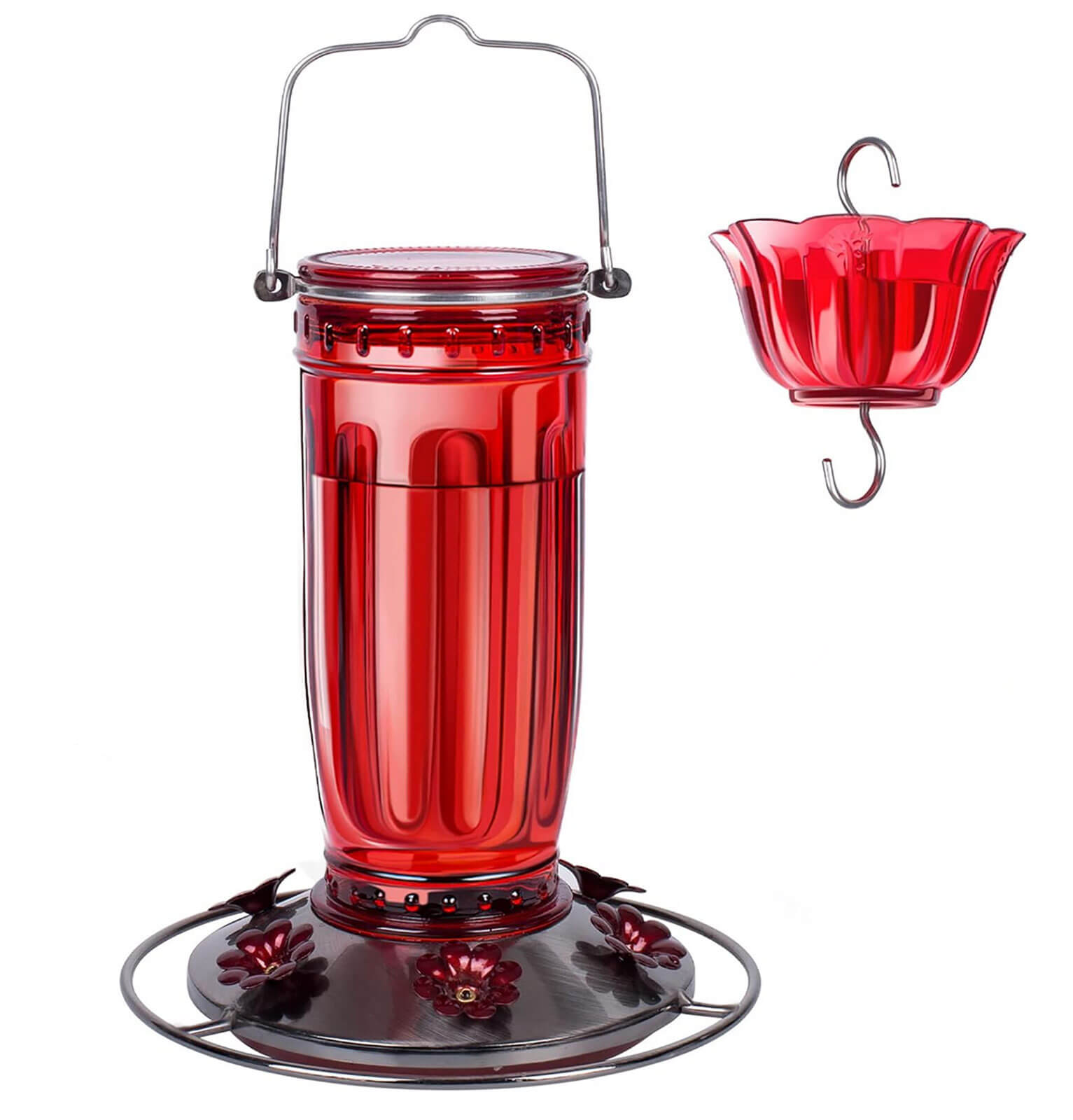 There are lots of feeders on the market and most will work fine. There are many that have yellow ‘flowers’ surrounding the feeding hole and that also seem to attract bees and wasps as well as the hummers. Since my wife moved to feeders with red portals, bees have not been a problem. Ant moats can help keep the ants form invading. This is a small moat you fill with water. If that gets breached a couple drops of cooking oil help a lot.