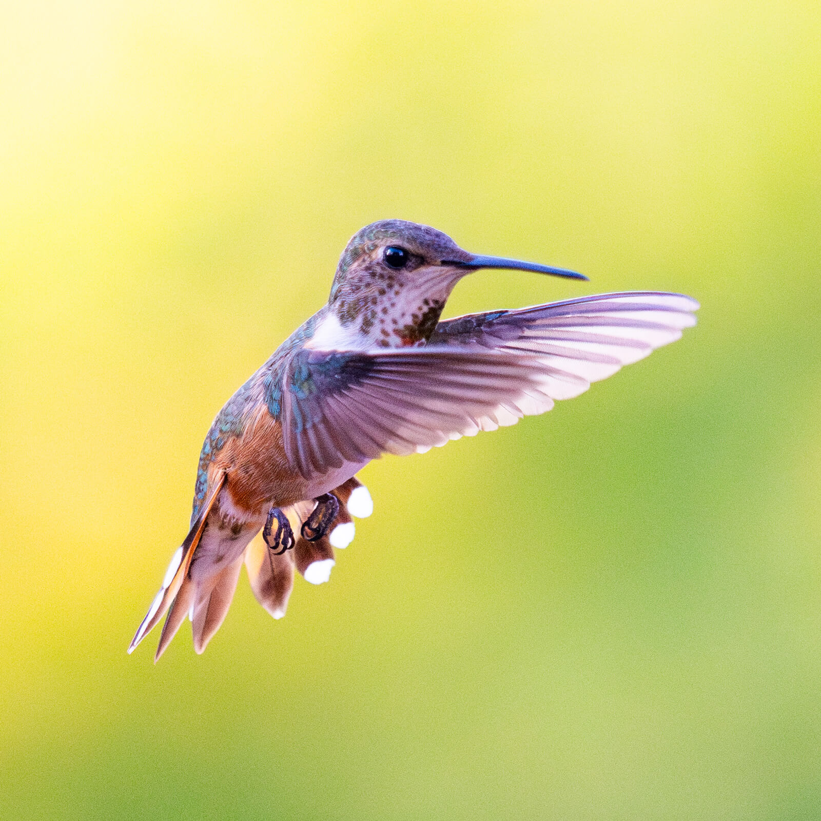 Despite the fact that the birds are flighty, they will also become used to human and camera gear presence pretty quickly. If you set up near a feeding station and just remain quiet and relatively still they will resume feeding. Watch for behavior. Many hummingbirds will make the exact same approach to the feeder time after time. Note where they go after having a sip or two. They often return to the same branch or perch each time. That enables you to pre-focus on a target and wait for the return trip. You can even set up some branches not too far away from the feeders to increase the possibility of a clean shot.