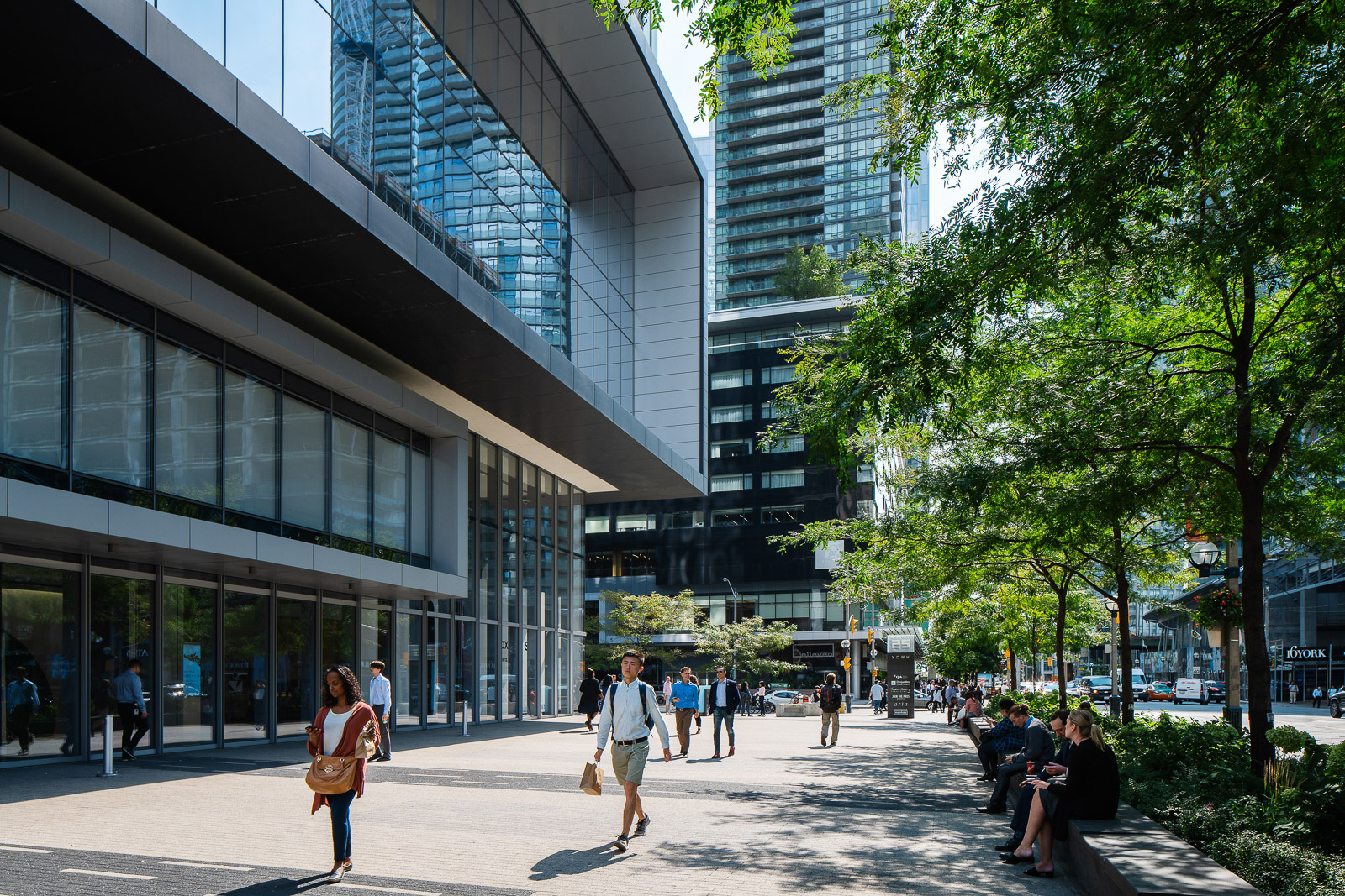 In the image below, the client wanted to communicate how busy the place is since it’s located close to a train station. Shooting around noon, when people are walking out to lunch and eating on the benches, was key.
