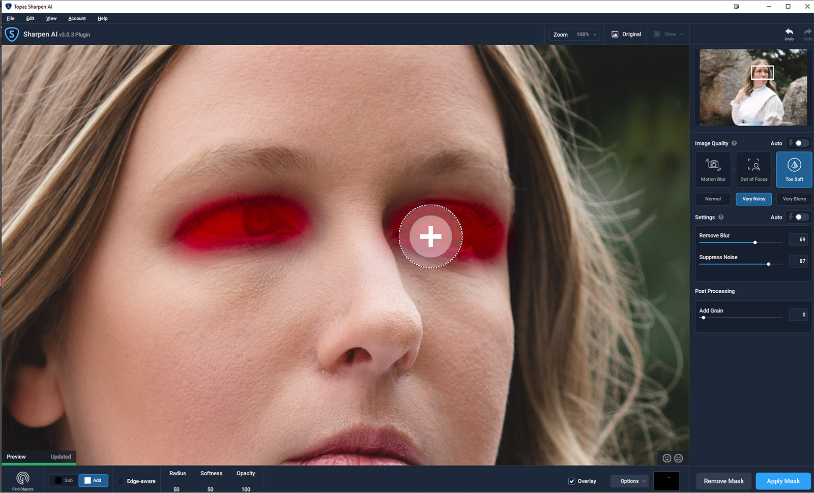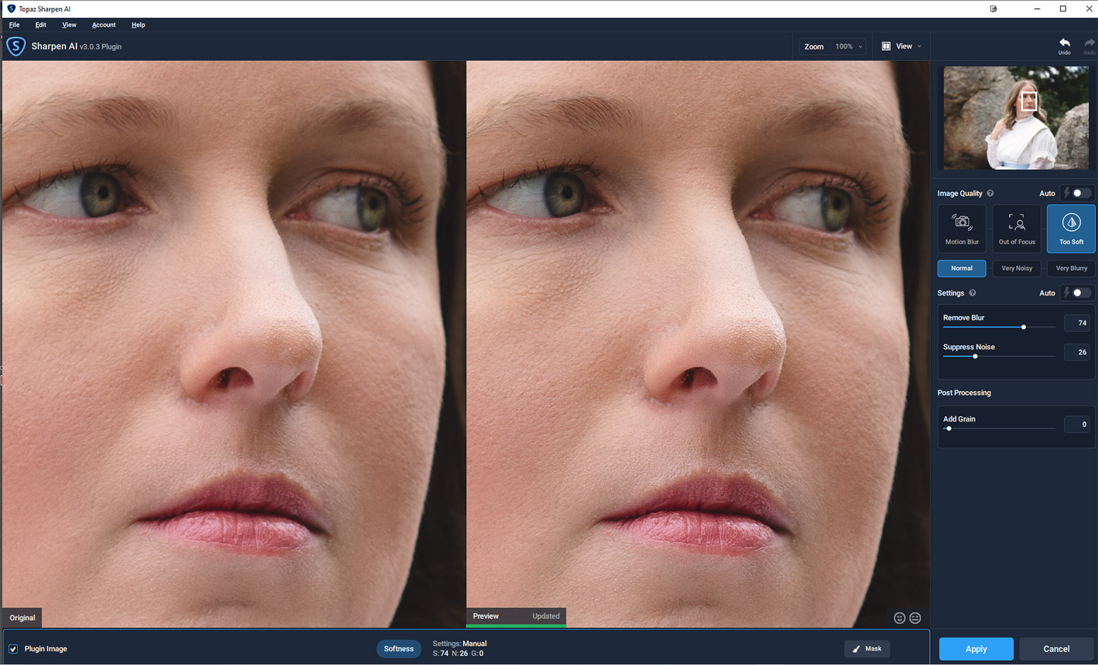 When it comes to portraits, the eyes really do have to be in focus. Blurry eyes can make for a less-than-perfect image. So if you have a slight camera blur or if the focus is just a tiny bit off, then Sharpen AI may be of help.