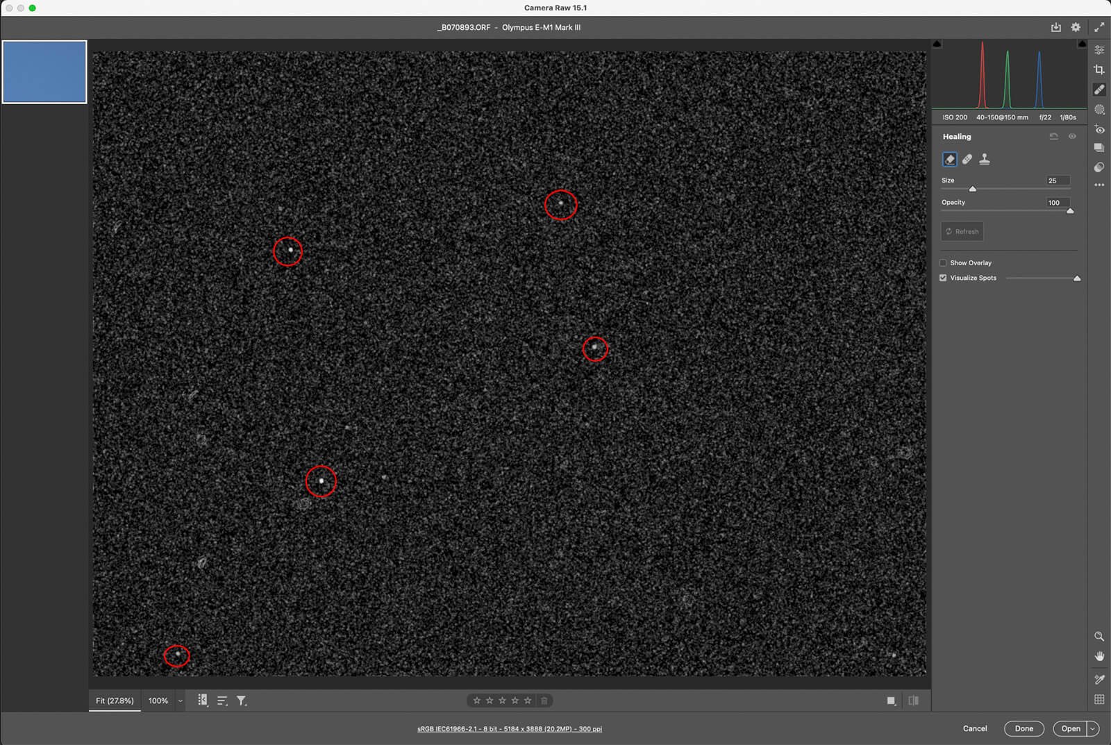 Look inside at the sensor. Shining a light, and if possible, add a magnifying glass. Even if you don’t always see prevalent spots there can be a degradation of your files. Test it. Make a photo of a plain white piece of paper evenly lit. Or, photograph a clear blue sky. Once you have downloaded your image open it in your processing software.