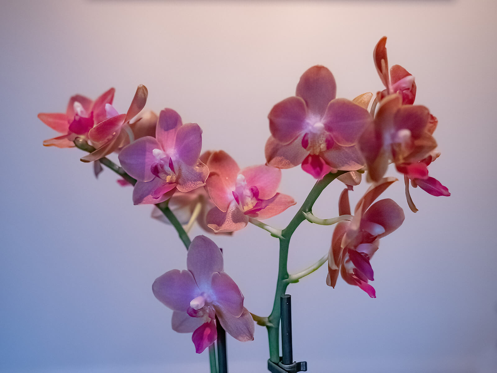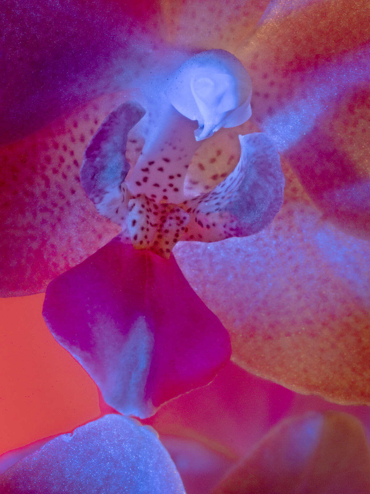 In this flower photo study I’ve played with three different lights. Two small light panels and a light tube supply layers of color and lots of possibilities. Here’s a couple images made of tiny Phalaenopsis orchid blooms. These were made with the Olympus 60mm f/2.8 Macro lens and the Olympus OM-D E-M1 Mark III.
