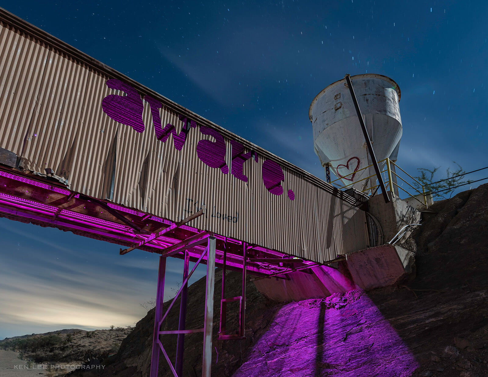 I’ll describe how we went about illuminating this photo during the long exposure. Collaborative light painting can be a beautiful, powerful method. But first, I’ll discuss the vandalism/art that you see in the photo.