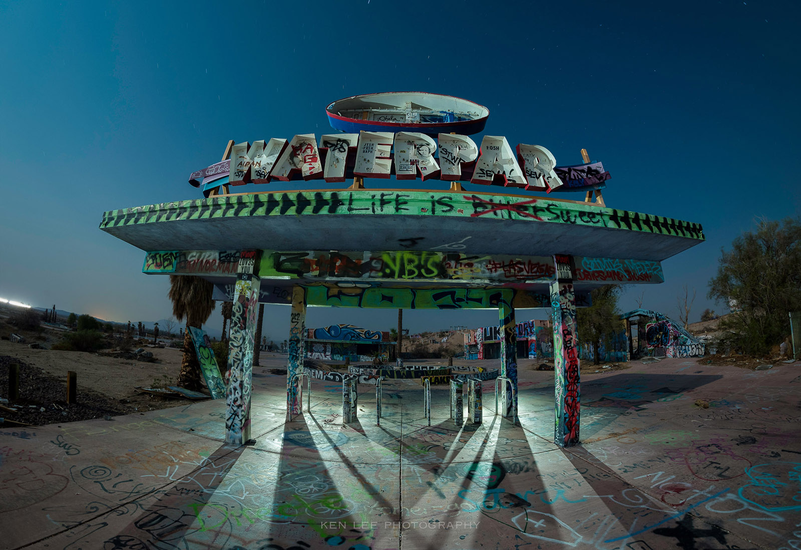 I recently explored an abandoned waterpark in the Mojave Desert at night. The park has been abandoned since 2004. I was drawn to the entrance, and I thought I could create some great shadows with this.