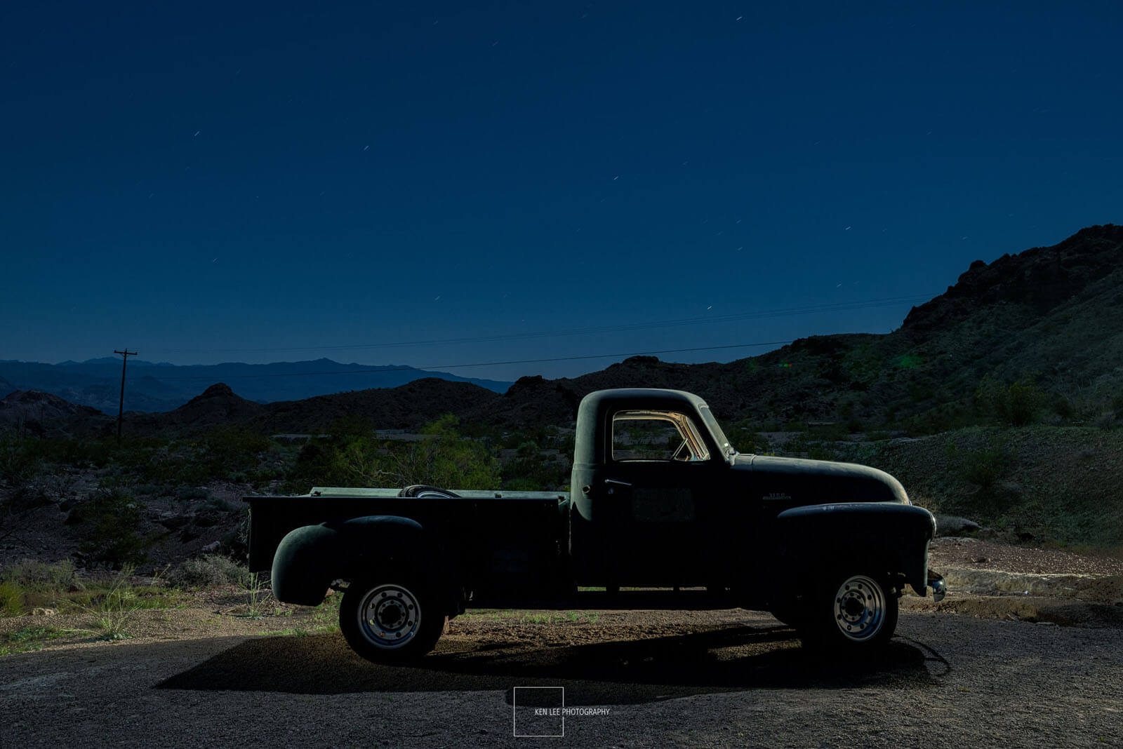 After running back down the hill, I stood in back of the truck. Holding the light as high as I could, I illuminated the back wheel well and the bed of the truck. This was again just to illuminate the outside lines of the truck. This mimicked the moon somewhat as well, also creating some rim lighting to create more drama and “pull” the truck farther from the background.