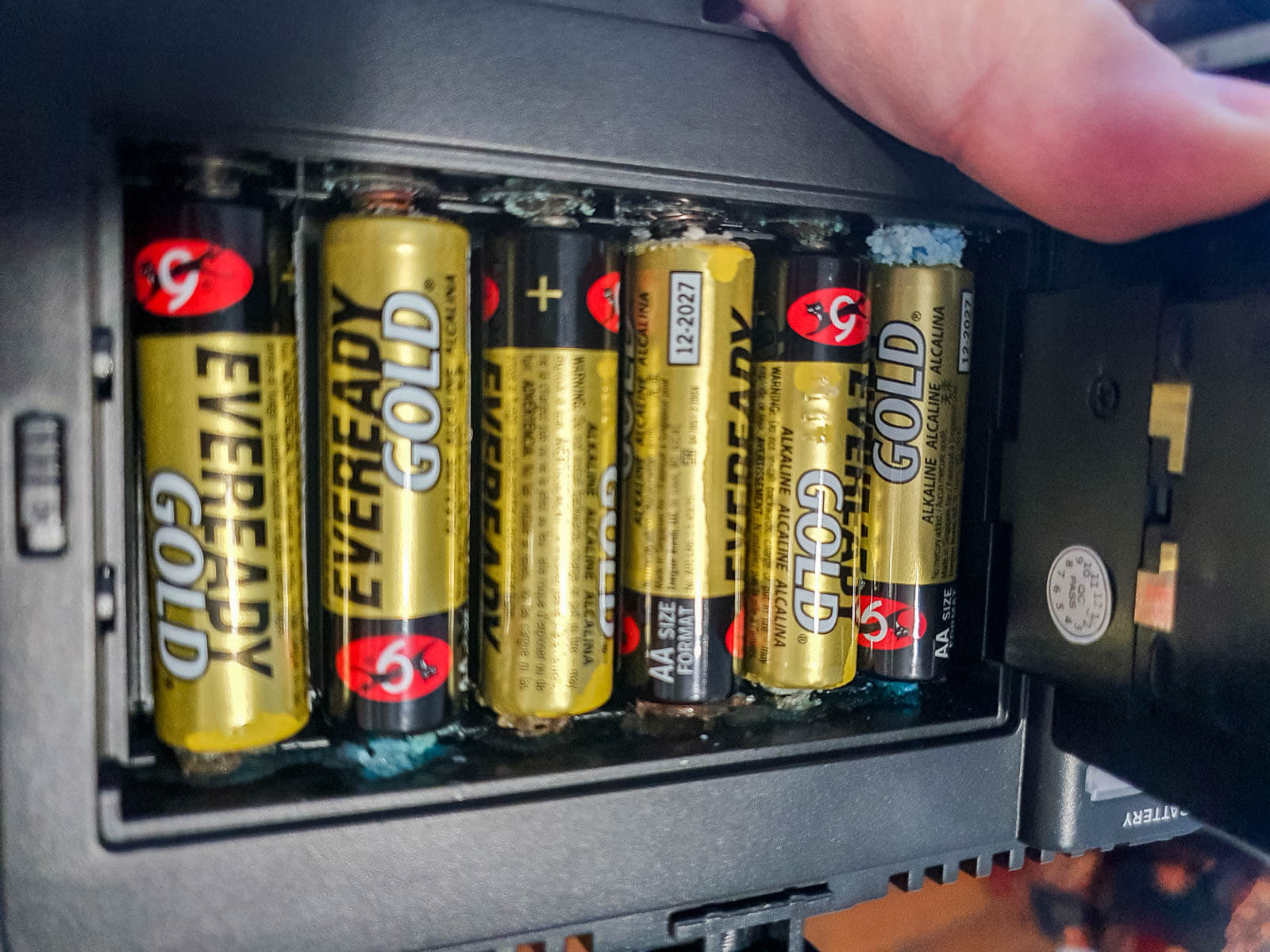 This time somehow I missed it. I couldn’t even use some steel wool to file the battery contacts clean again. It was like a crystal forest in there.