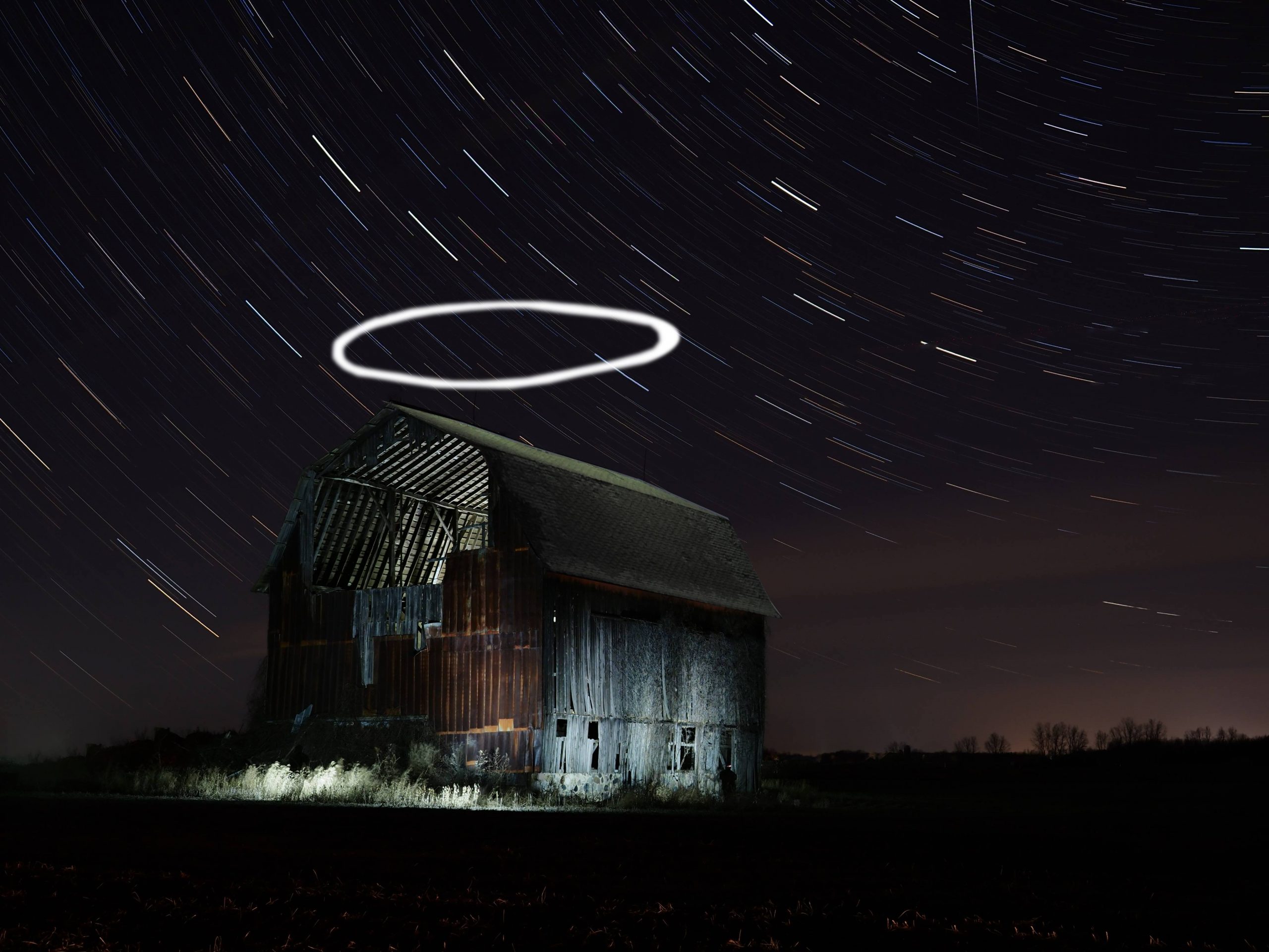 From there, we got the Lume Cube into place, and Jamie let the drone loose, using a predetermined path to guide the drone in a circle over the barn. It took a bit of time to get it at the right height, and the wind caused a few weight distribution issues with the Lume Cube attached. The first time, I got a random zigzag of light due to not clicking the shutter at the right time. My second attempt was a little more successful.