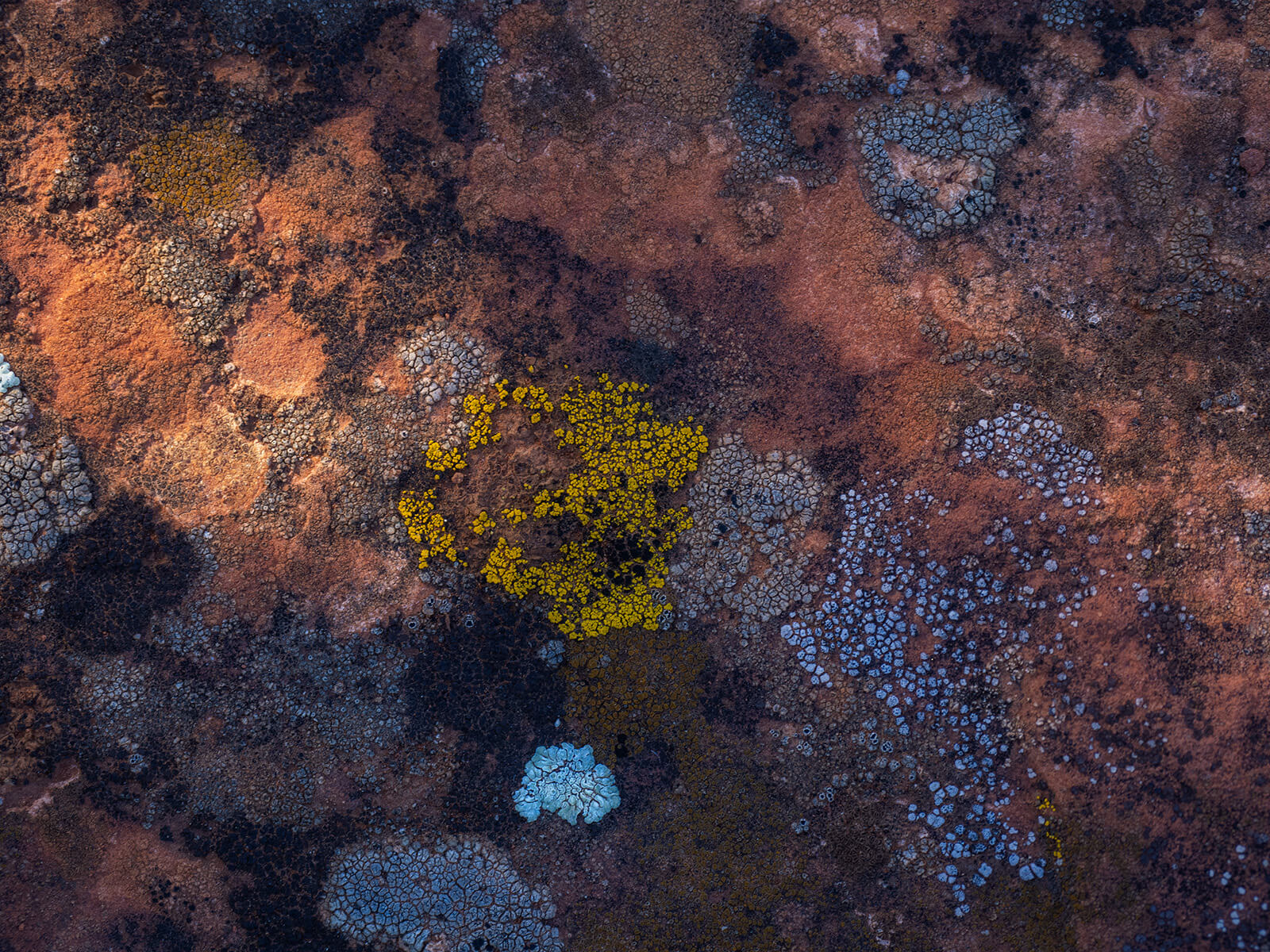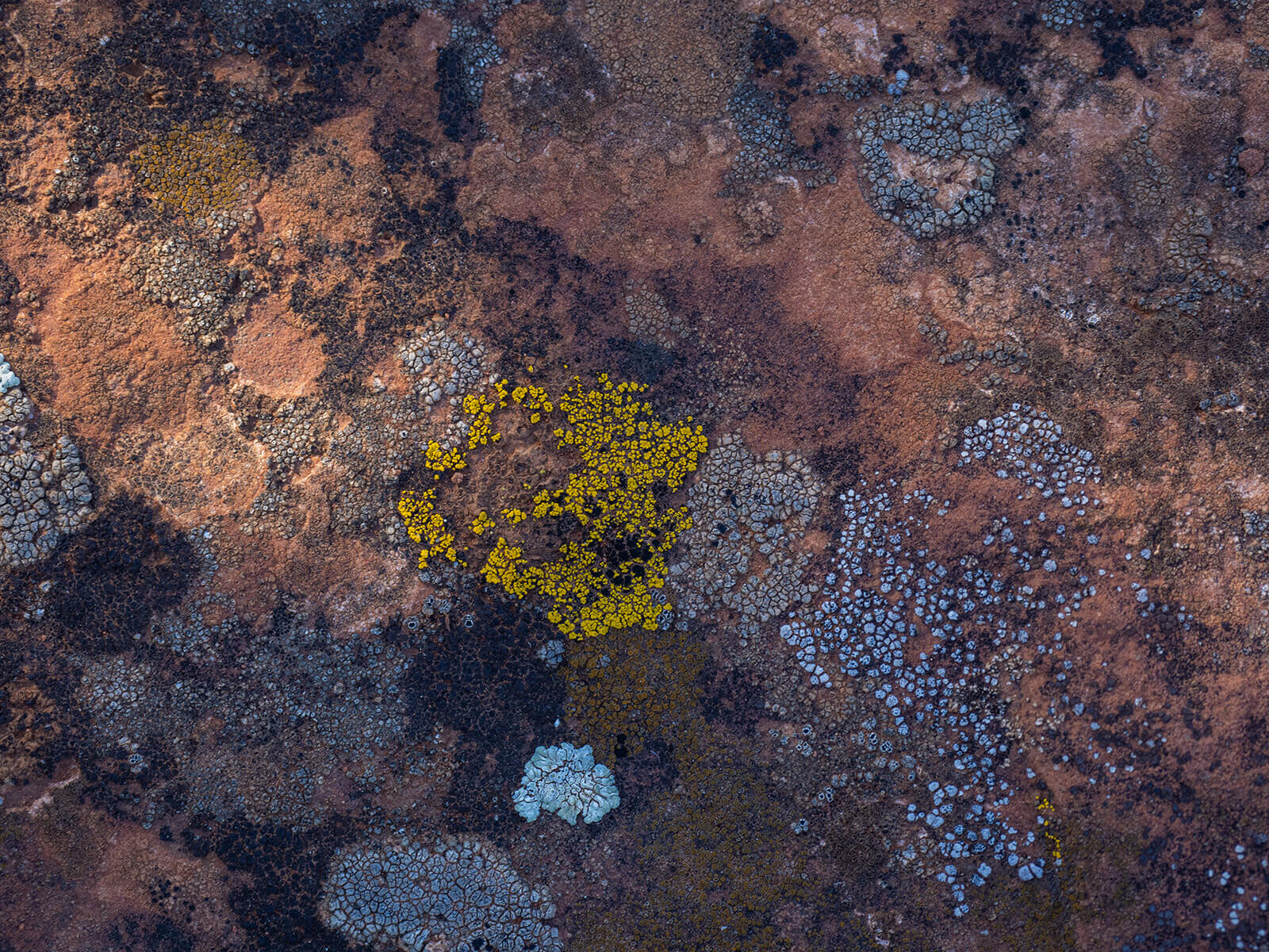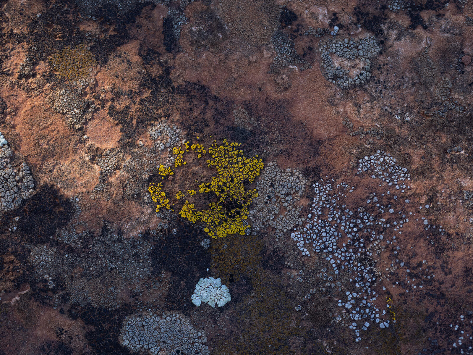 Light and shadow along with the color palette was what attracted me to this scene. There’s a need to go slowly in order to not bypass some wonderful opportunities. For example, the lichen littering the red rock was filled with wondrous patterns, colors and textures. Lichen forms on exposed rock faces and are life-forms that weather the rock surfaces and extract minerals to become source materials for their bodies.