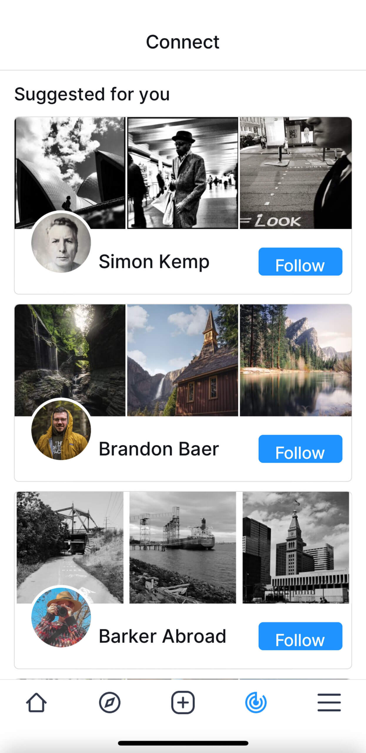 When you join, Lyrak makes you connect with other people immediately. It doesn’t matter whether you know them or not. The list is short. I don’t remember how many photographers there were. Maybe 30? If you want to continue using the app, you must connect with five of them.