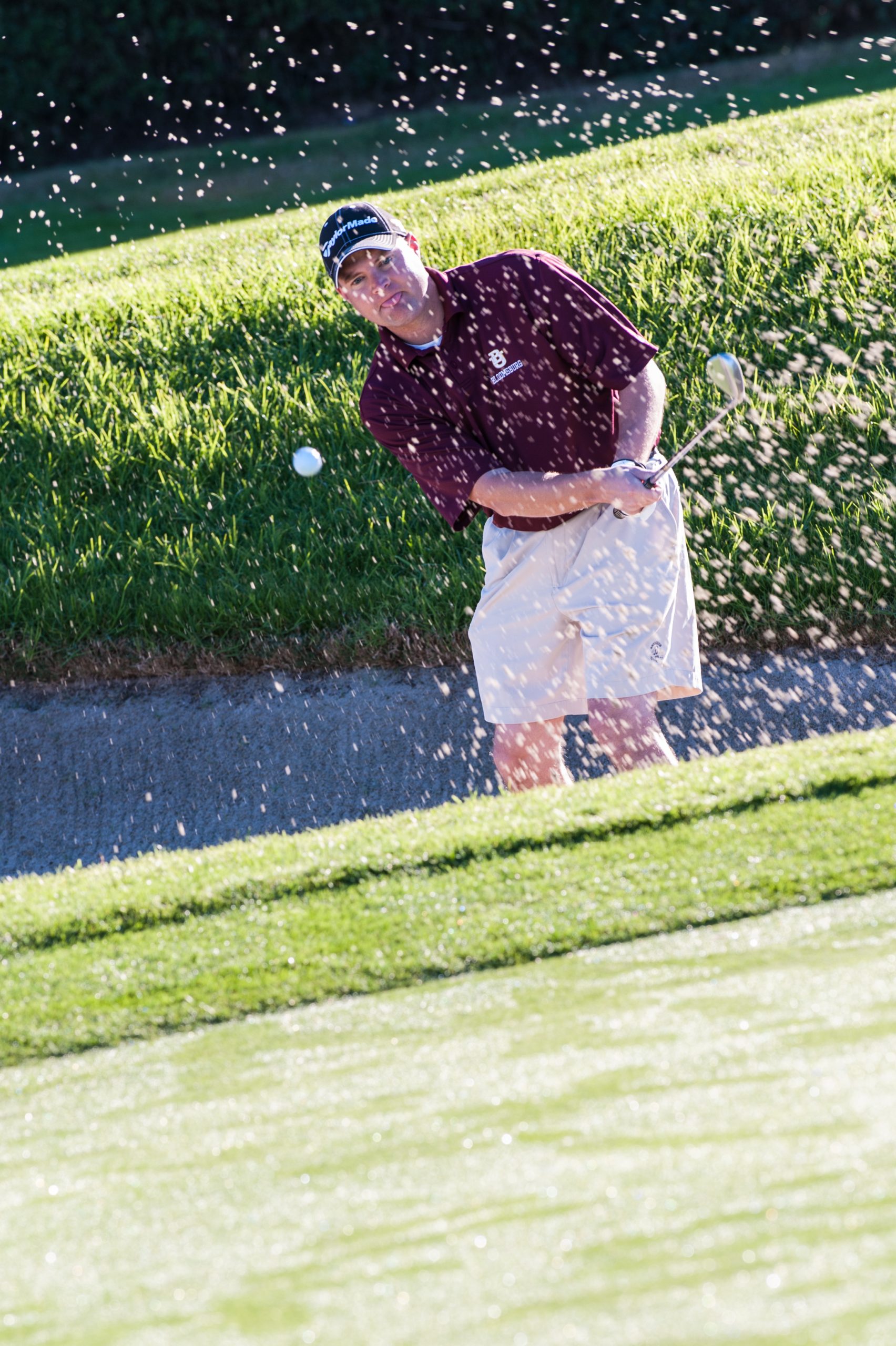 During a golf event a few years ago for an accounting firm, I started to get bored taking the traditional team photo on the green. So I decided to make a few shots happen. I saw the CEO nail a nice shot and it just missed the sand trap.