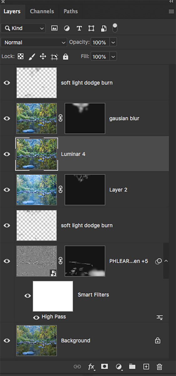 Following the blending of exposures a bit of cleanup was needed. Small changes were made using the Clone Stamp, Spot Healing Brush and Patch Tools. Additional work was done on the shadows and highlights with Soft Light Layers to dodge and burn, which adds additional depth and dimension.