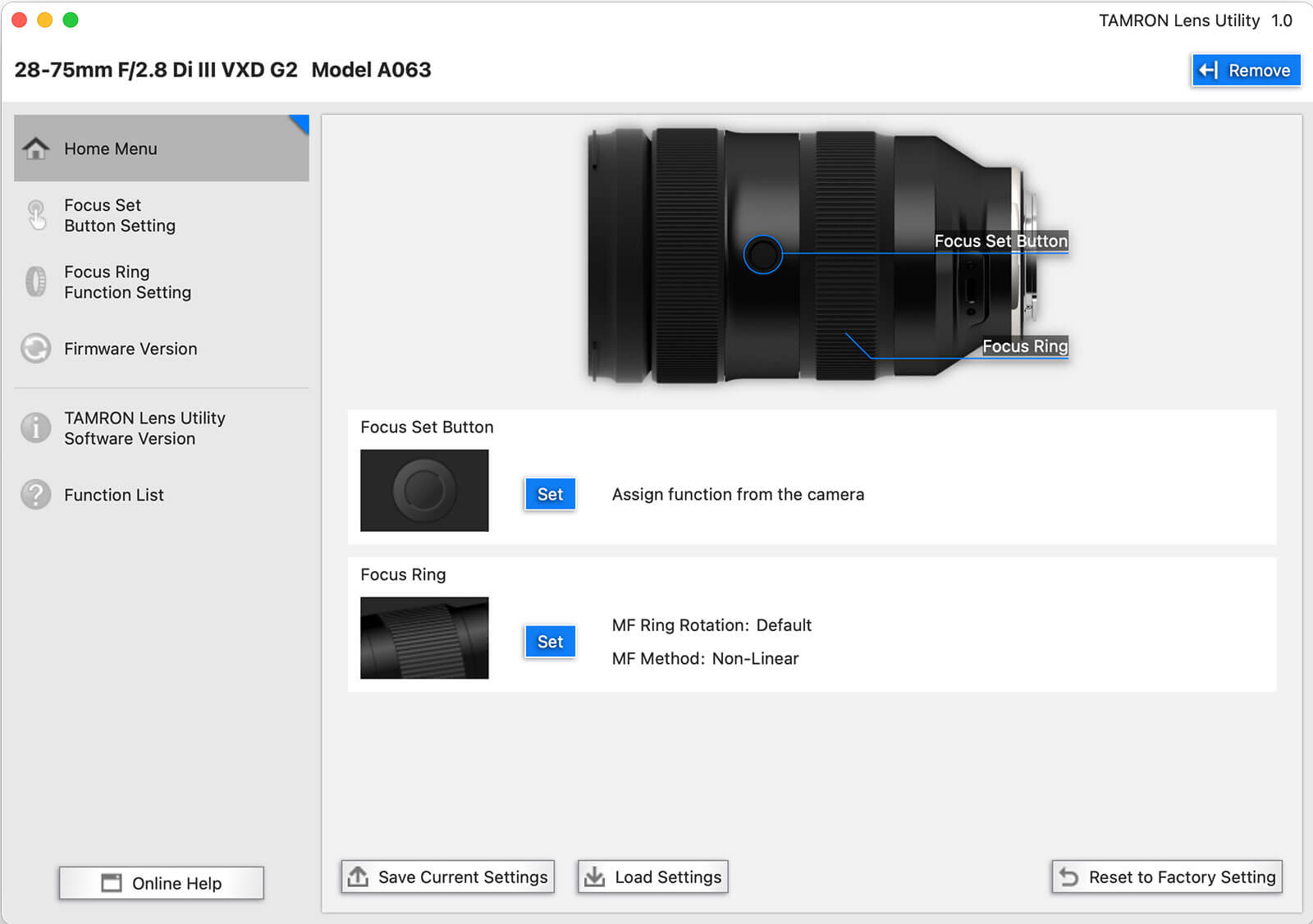 You can see all the different functions you can choose from in the screenshot below. You can also save and load settings, so when you pick up new Tamron lenses, your settings can be applied to those lenses without having to dig through the software.