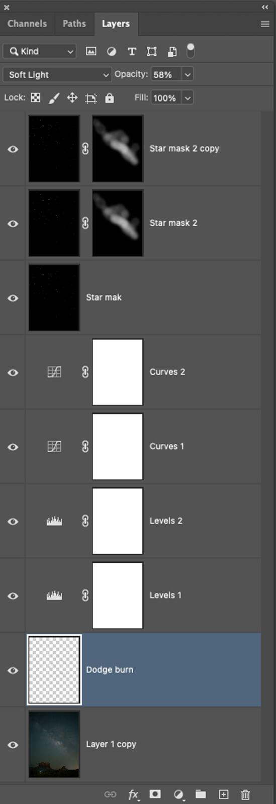 If you want to take your Milky Way processing to another level you can remove, then replace, the stars. This allows you to process the nebulas, color and clouded areas separate from the star field. This process is called stretching the file. Use Levels and Curves Channels in very small increments to move the Histogram and secure the color for which you are looking. I personally recommend processing that enhances and shows the Milky Way without going overboard crushing blacks and hitting it with a Saturation stick. But this is your art, process as you will.