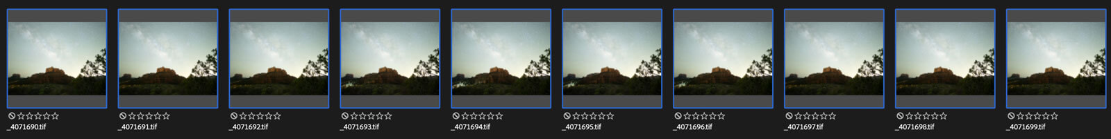 First is the gathering of the images. In this case, a higher ISO and longer shutter speed are employed. Reference the Histogram on your camera to make sure you are getting enough exposure. It is easy to think you have plenty of exposure if you depend upon the back of the camera. The fact that it is dark and you are viewing a transmissive backlit image can fool your eye. Histogram, make it your friend.