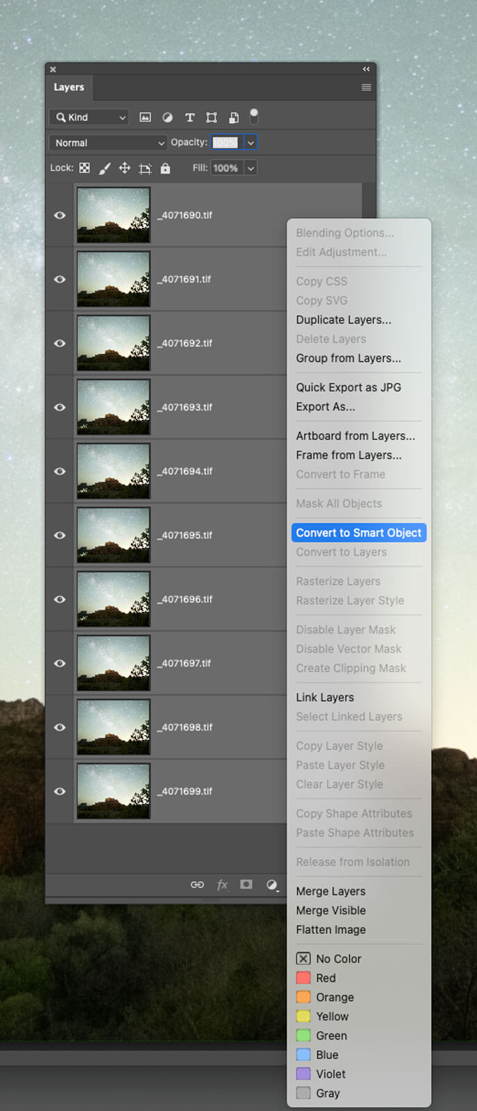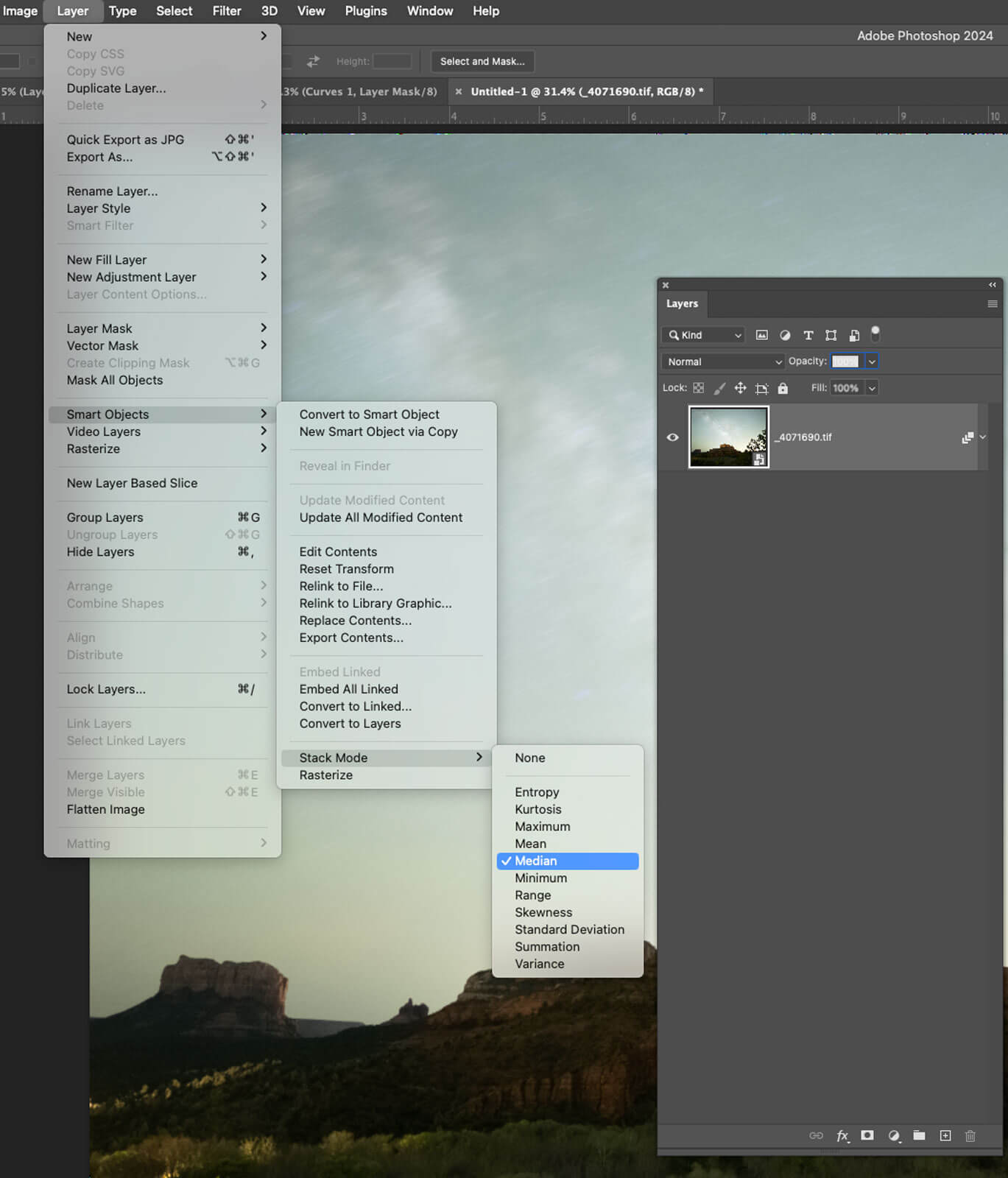 Once you have the layer stack in Photoshop, select all of the layers. Hold down the CTRL key on the MAC or Right Click on PC. In the resulting dialog box, convert the layers to a Smart Object. Next, navigate to the Layers Menu > Smart Objects > Stack Mode > Median. Noise gone. Nice!