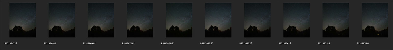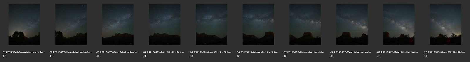 Take those frames into your preferred processing program for initial exposure and color work. Follow that by stacking your images in layers in a single file in Photoshop. Select all the layers and turn into a Smart Object. In the layers menu navigate to Smart Object > Filters > Median Filter. This help you control the noise created by using high ISO. Here’s a more in-depth article on using the Median Filter.