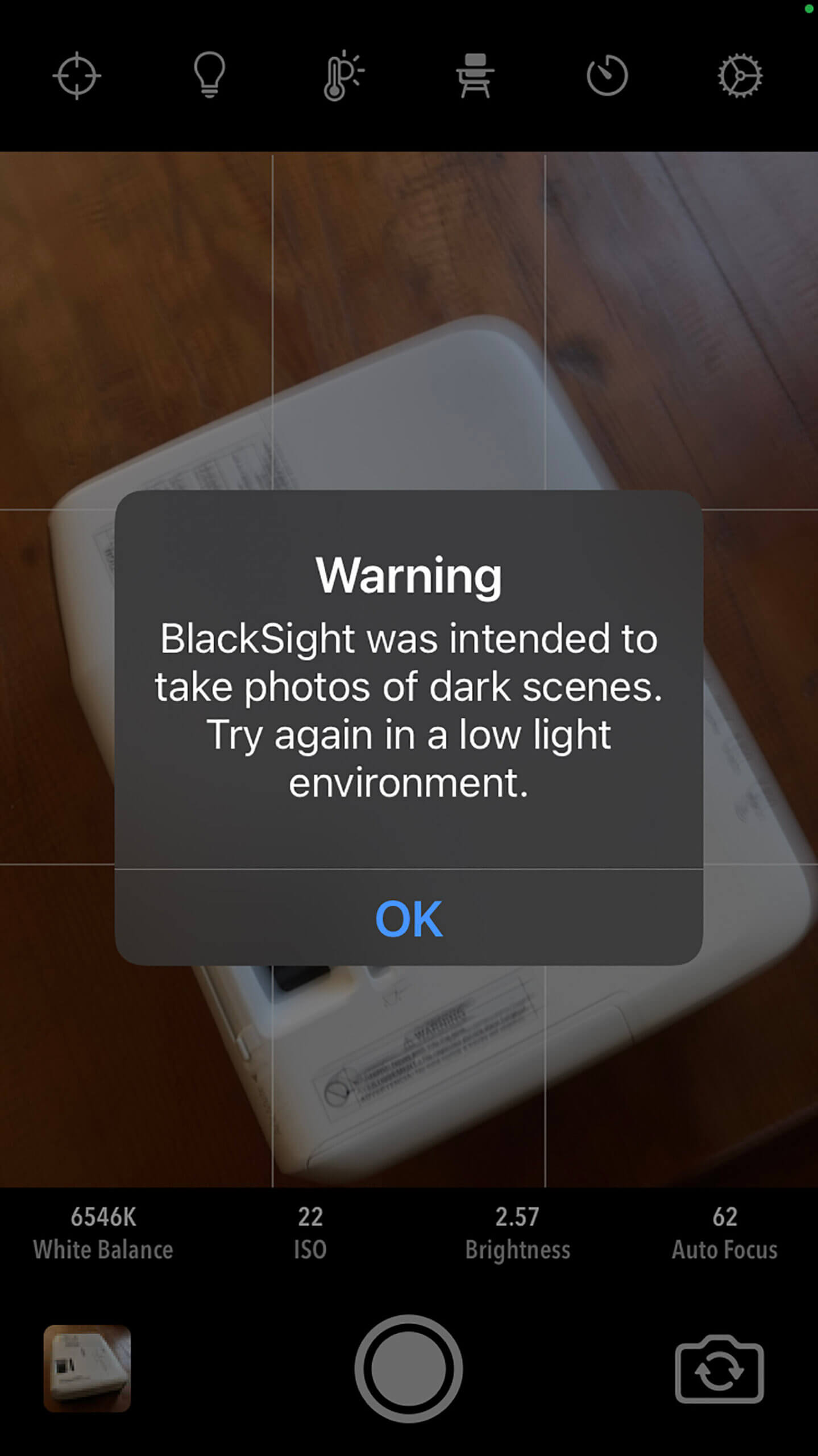 BlackSight takes several photos and uses computational analysis to blend them together. When you take a very low light photo with BlackSight, it will tell you to hold very still until it has completed its round of photos. This may take a few seconds.