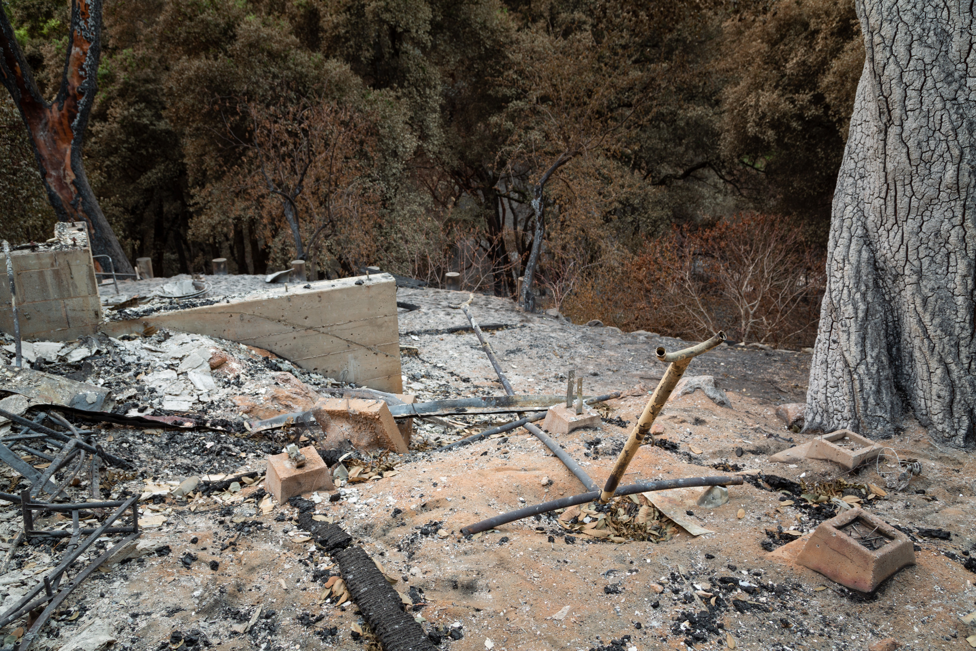 The next day I got a message from a friend who got out of the worst of the worst with essentially the shirt on her back. She asked if I could please get her some pictures of her beloved mountain home near Bonny Doon. I’ve avoided being there for several reasons. It’s just not safe because the trees are burned, weakened and can fall without any warning. Portions are still burning. On top of that, it’s so intimate — photographing the devastation that was somebody’s home.