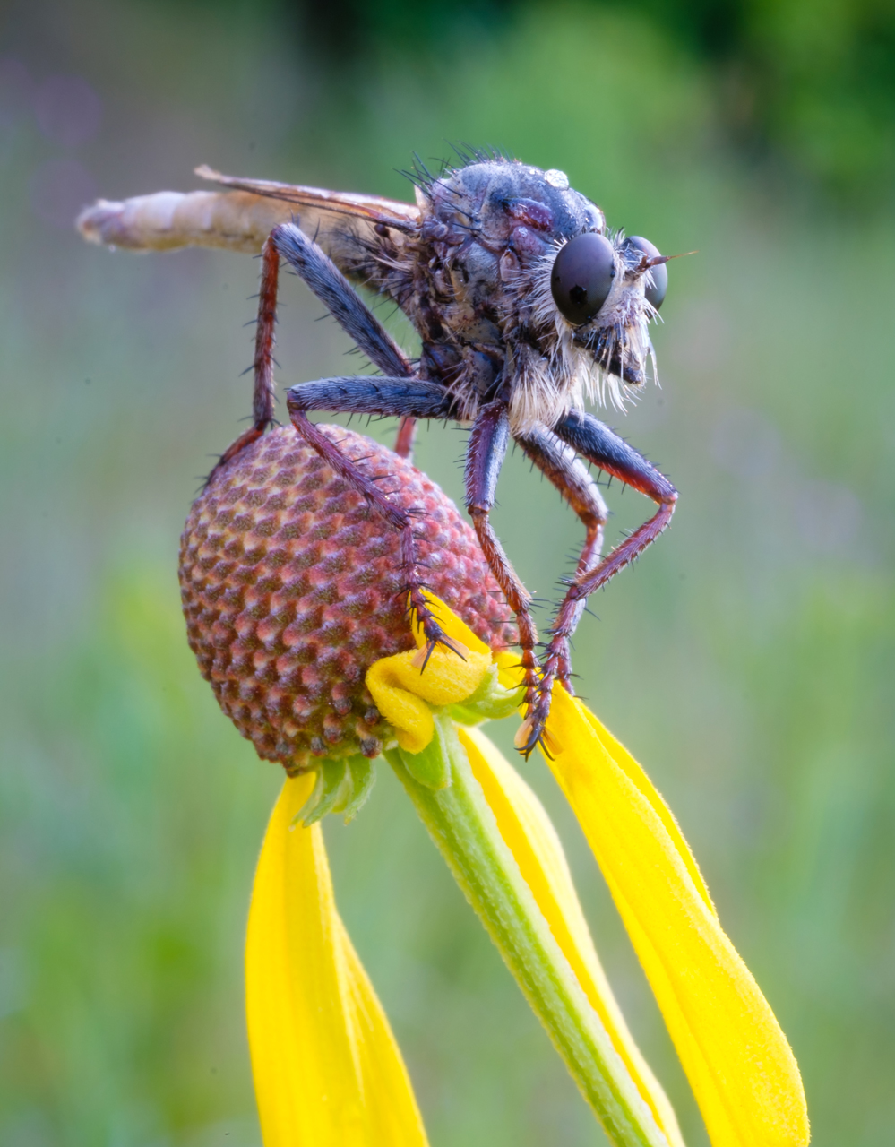 Since I was shooting bugs and flowers, I also brought 2 plamps and a plamp stake with extensions. A plamp is a clamp which allows you to stabilize windblown subjects such as flowers. One end attaches to a stake (or other support such as your tripod) and the other end attaches to the subject. A plamp can also be used to hold reflectors, diffusers, and even small flashlights.