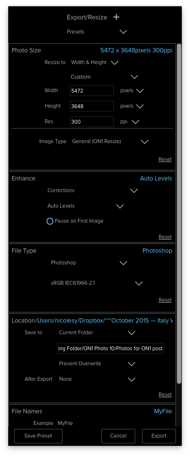 The export process has now been added to each module, allowing you to export a photo immediately after processing it and use the Perfect Resize technology from anywhere in the software. (“Resize” has been removed integrated with the other modules.) Here’s a look at the new panel (click here for more details):