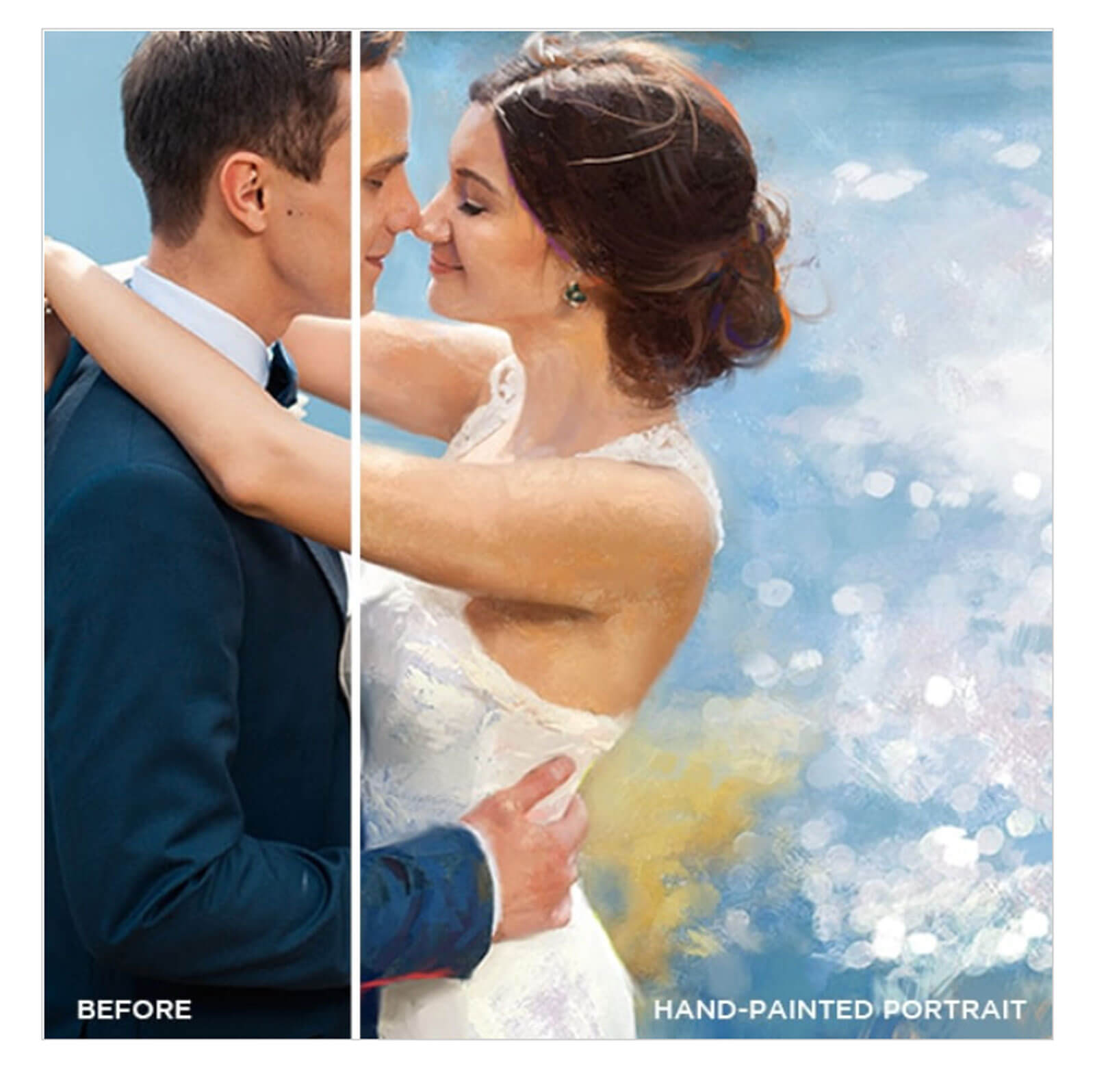 Upload your most memorable moments together — wedding photos, engagement photos, family reunions, baby photos and more! A master portrait artist will digitally recreate your entire photo from scratch using hand-painted brush strokes.