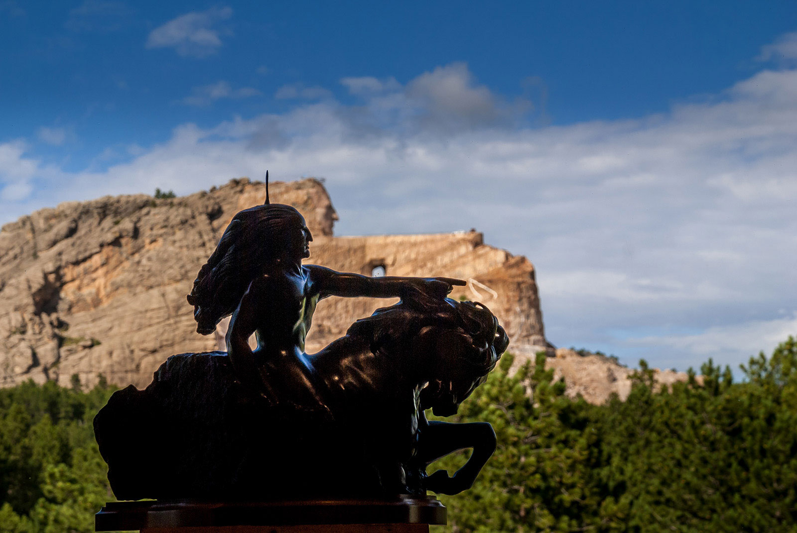 Roughly 20 miles from the Presidents, another massively scaled monument is being carved out of the granite. This one will depict the Oglala Lakota war chief Crazy Horse. He’s mounted on a horse and pointing a finger toward his tribe’s ancestral lands.