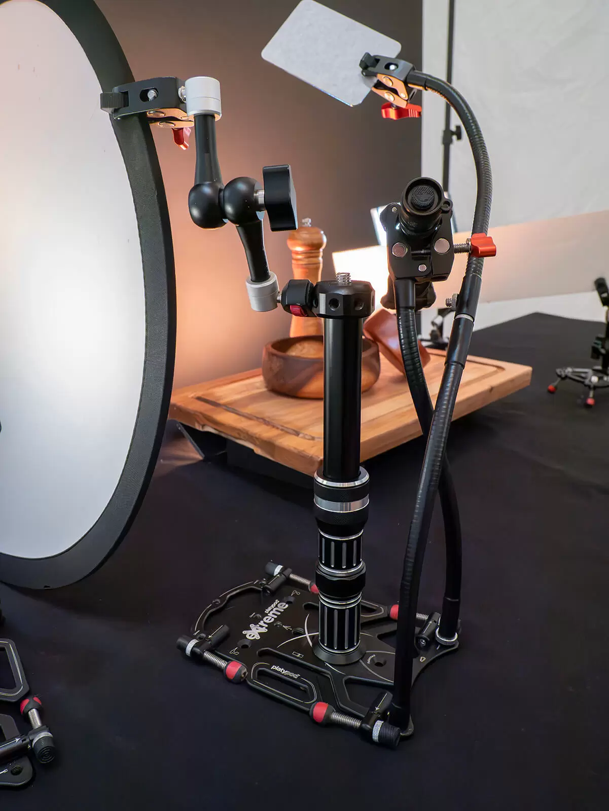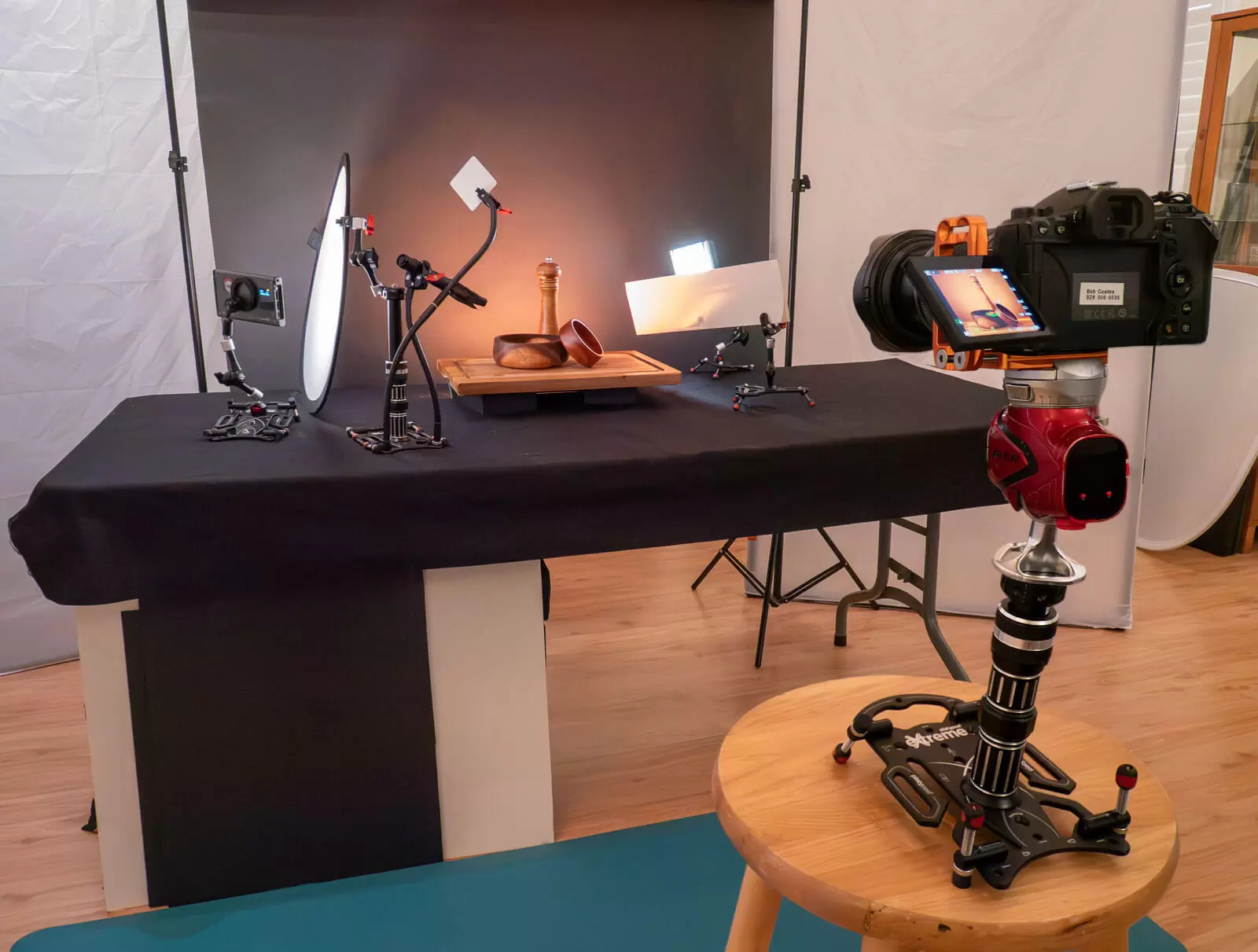 I used an OM System OM-1 camera with a 12-100mm M.Zuiko f/4.0 lens. It was mounted on an Elite Ball head. I placed it on a bar stool verses using a tripod. I find that the less legs from tripods and light stands keep me from messing up my set. The Platypod gear makes it easy to keep a very clean set.