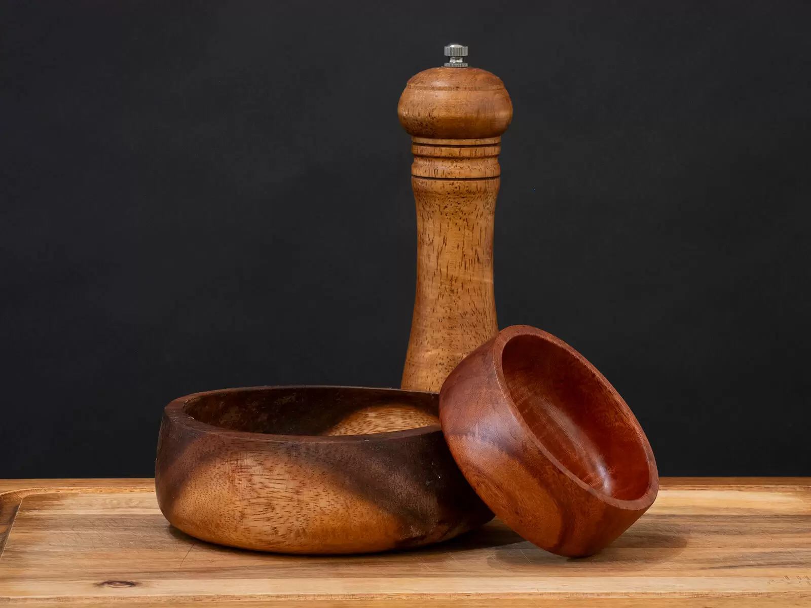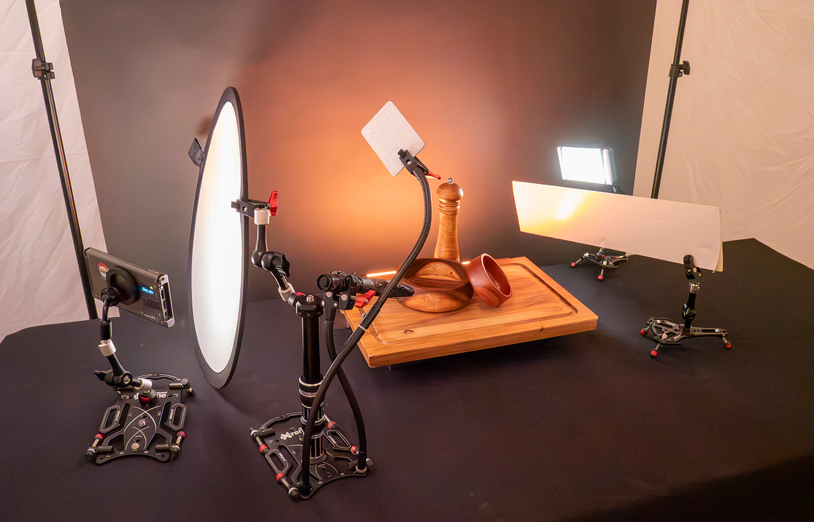 Here’s an overview of the lighting and supports for the wood photograph. A scrim is used to create a larger light source from camera left. The right side has an RGB panel light with diffusion material to create a specular rim from behind. This serves as the main light. It is partially masked off with a gobo to keep light from flooding the set. In addition, a small flashlight is kicked in to the front of the wooden bowls and shadow area to keep it from being blocked up in the shadows.