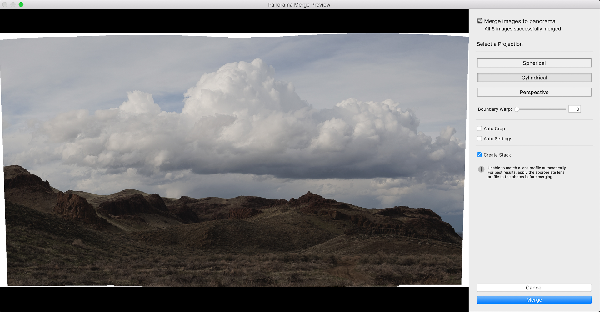 If you’re doing your first panos, I suggest starting with just two or three frames. It can take some time depending on your computer, and using more frames takes more time. Lightroom offers three different projection methods — just try them and choose the one that looks best to your eye. This picture used six frames.