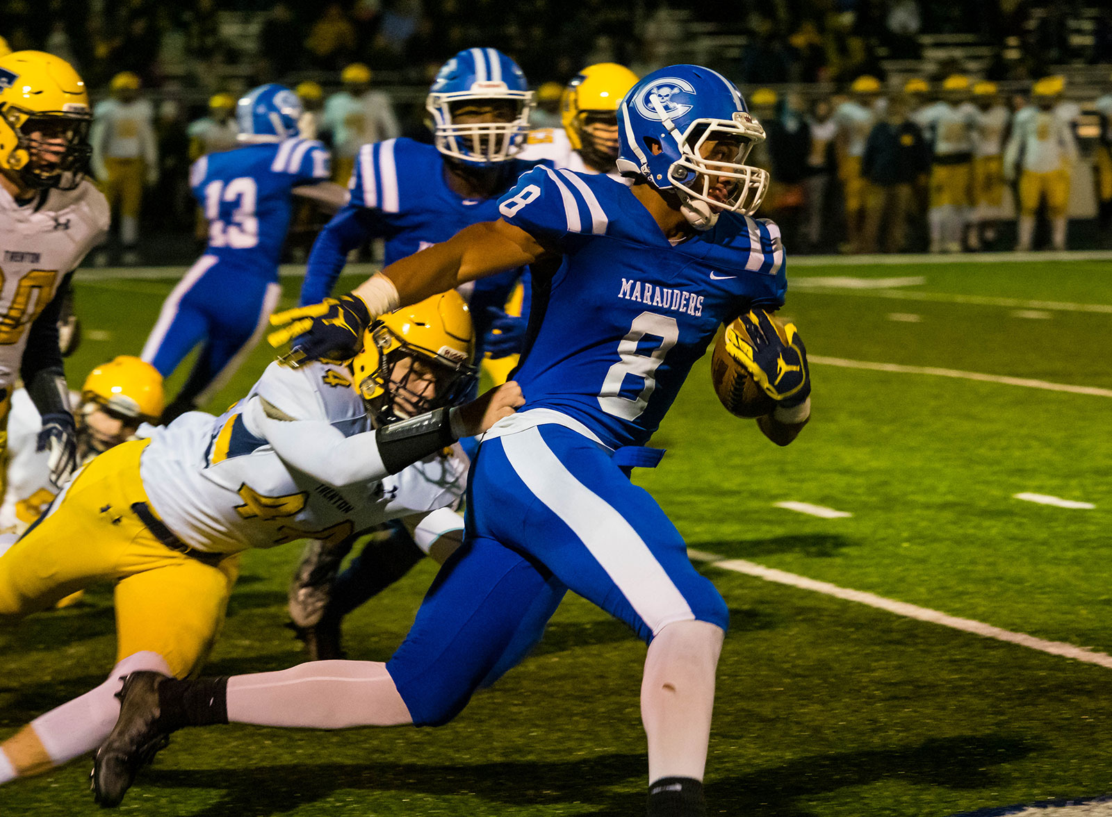 This gives me a bigger set of shots to pick from, one where the athlete looks your way, or they are in a nice Heisman pose or dodging a block. The pictures below are 1/18s apart, which works out to 56 milliseconds. But look at the difference in pose between the frames. If I had been shooting at 10 FPS I wouldn’t have gotten the middle frame, which is a much better pose. The nice part is I got several to choose from, that I wouldn’t have had at a slower frame rate.