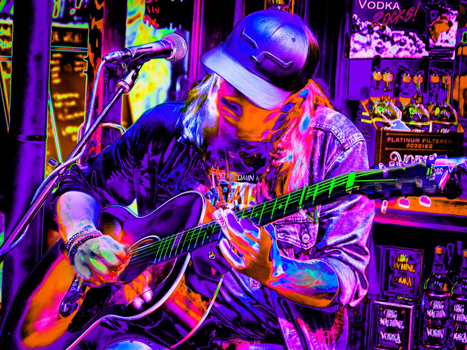 Since I shoot musicians as part of my job, this was like a busman’s holiday. No holds barred on the processing and in keeping with the NashVegas theme I hear about, I made this an electric presentation playing in post. I used copies of layers set into different blend modes along with messing about with extreme curves adjustments.
