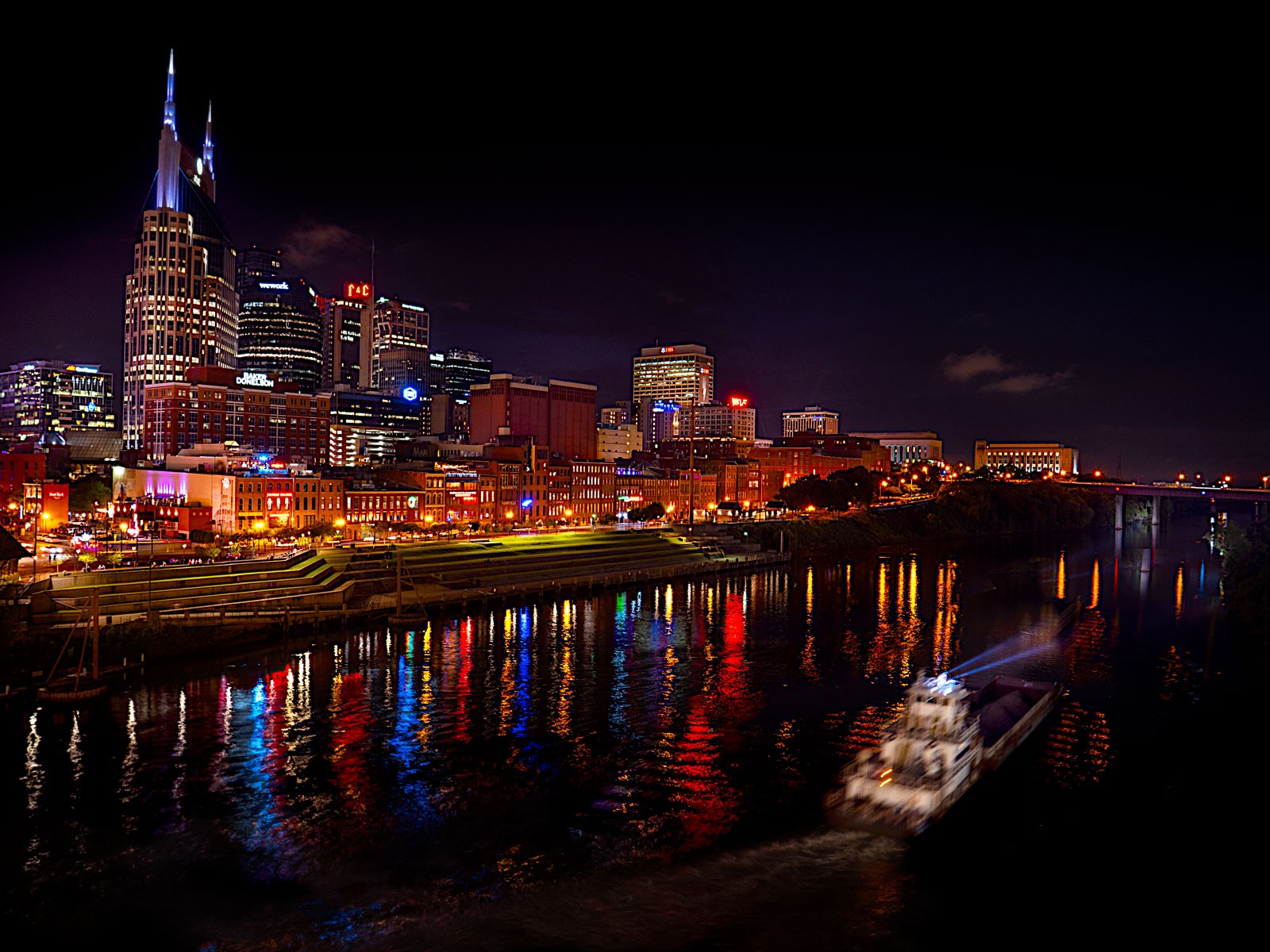I got an added bonus as a barge with a spotlight was working its way down the Cumberland River. Suddenly I saw the vessel and ran across the bridge to see if I could add more interest to the scene. You be the judge.