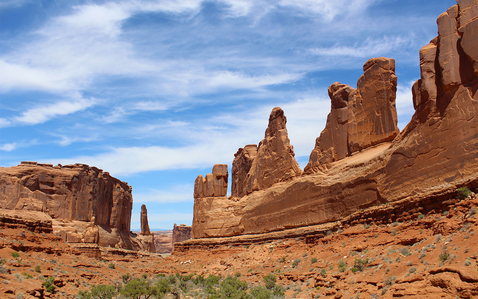 As you enter the park, the Park Avenue Viewpoint gives you a look at a fantastic canyon. The trail has a steep descent, so get your shots from the viewpoint railing. Continuing along the road, you’ll be able to grab photos of well-known rock formation such as the Three Gossips, Tower of Babel and Courthouse Towers. Several miles later, there is a turnout for Balanced Rock, a photographer favorite. You can get photos from the parking lot, but a very short path will get you closer.