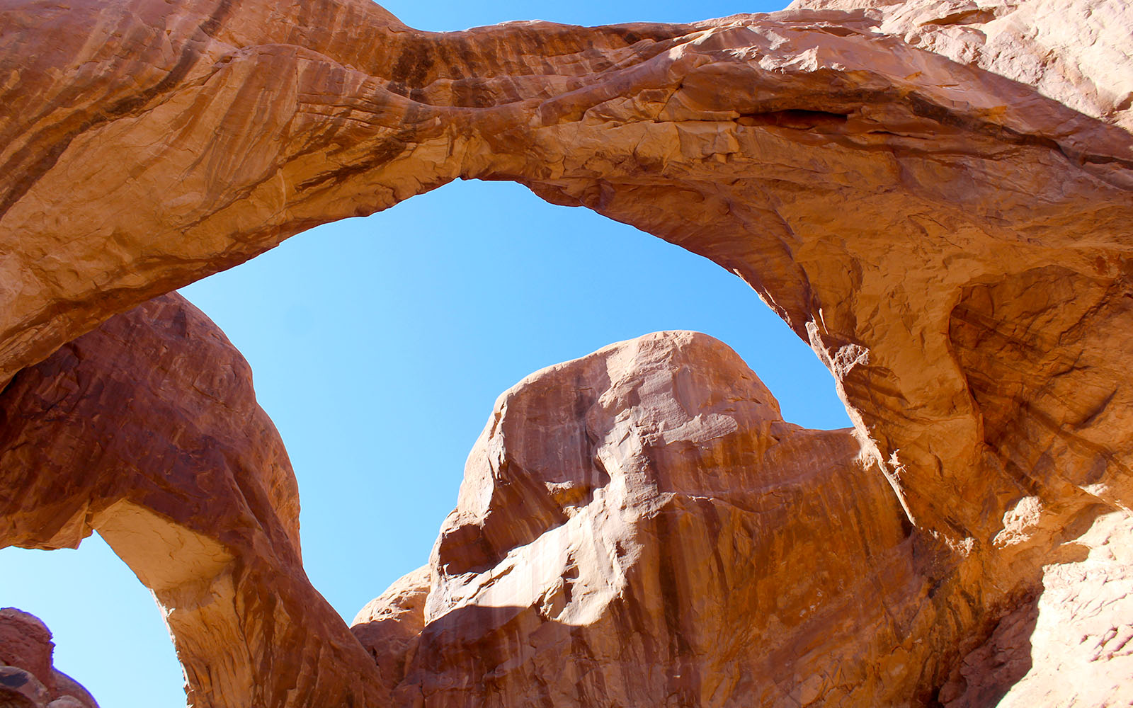 If you take the turnout to The Windows area, the road will terminate at Double Arch. This is a flat, easy half-mile round trip hike to see two large arches joined at one end. This is my favorite arch. If you want to get underneath the arch, some rock hopping is required, but you can get some great photos on the approach.
