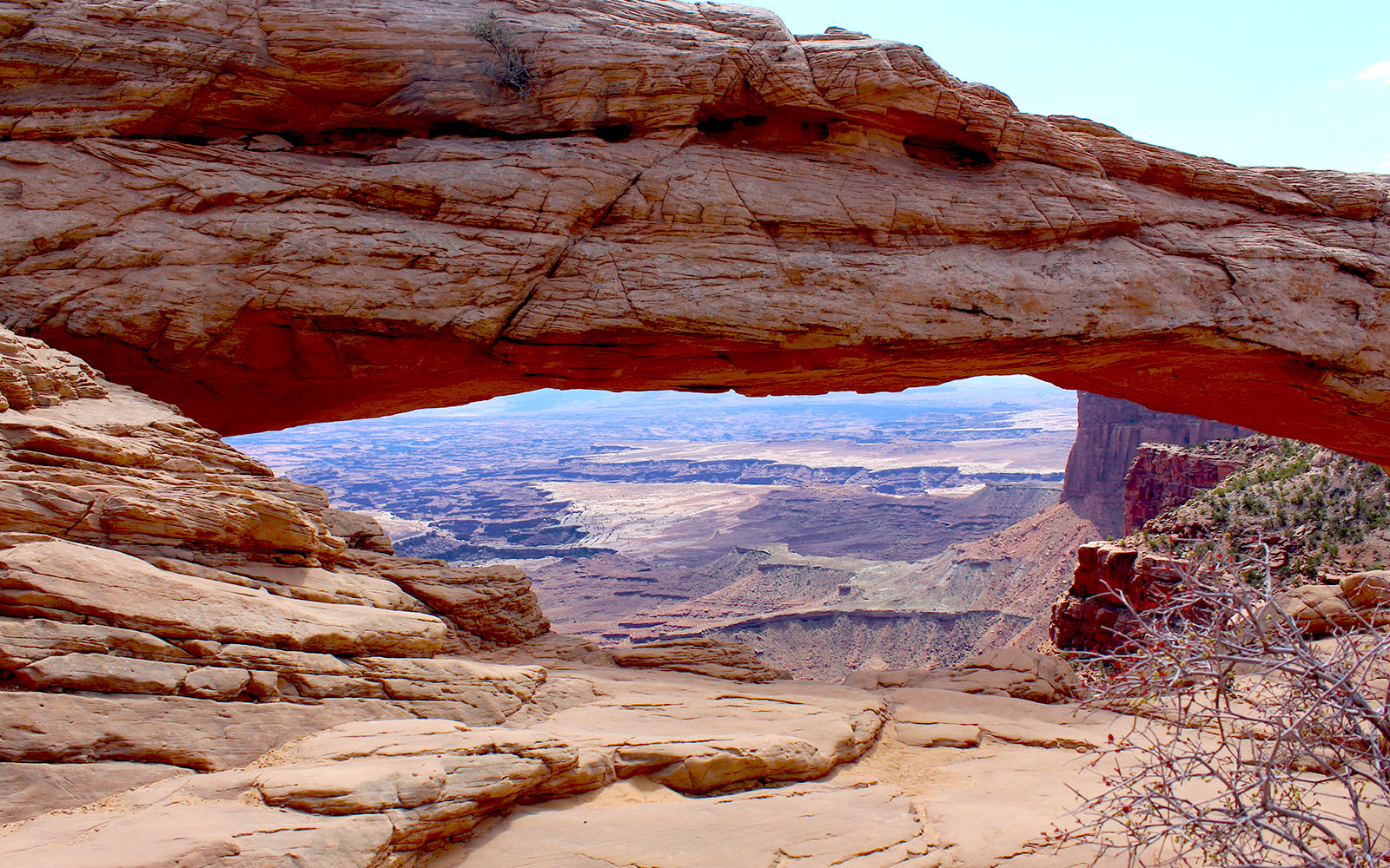 Near Arches, Canyonlands is a park split into several sections. In the northern Island in the Sky section, Mesa Arch should be your first destination. This arch offers an amazing view because it’s at the edge of a cliff. The short half-mile round trip trail distance makes it extremely popular. However, it’s an easy trail with beautiful vistas, so it’s worth dealing with the crowd.