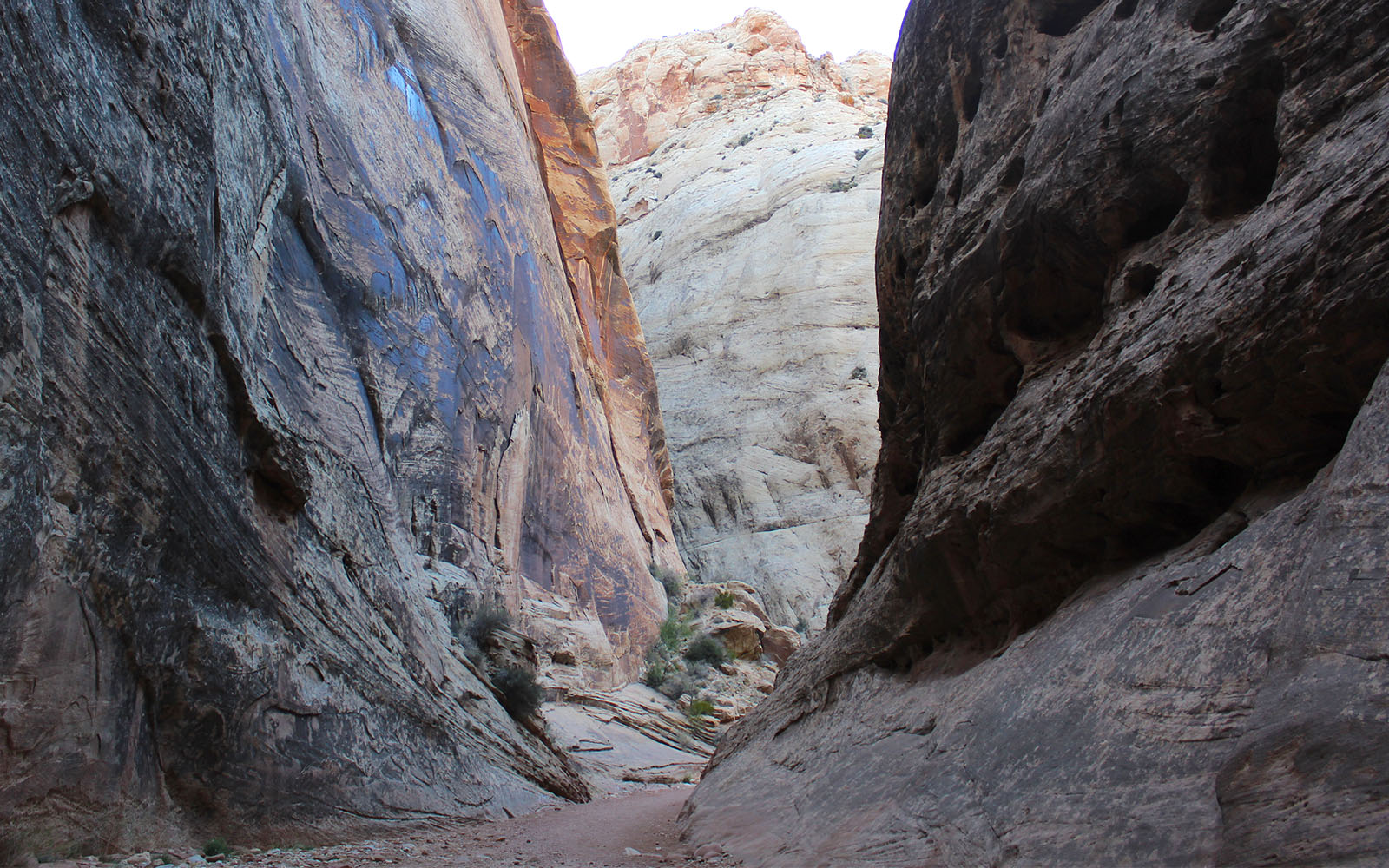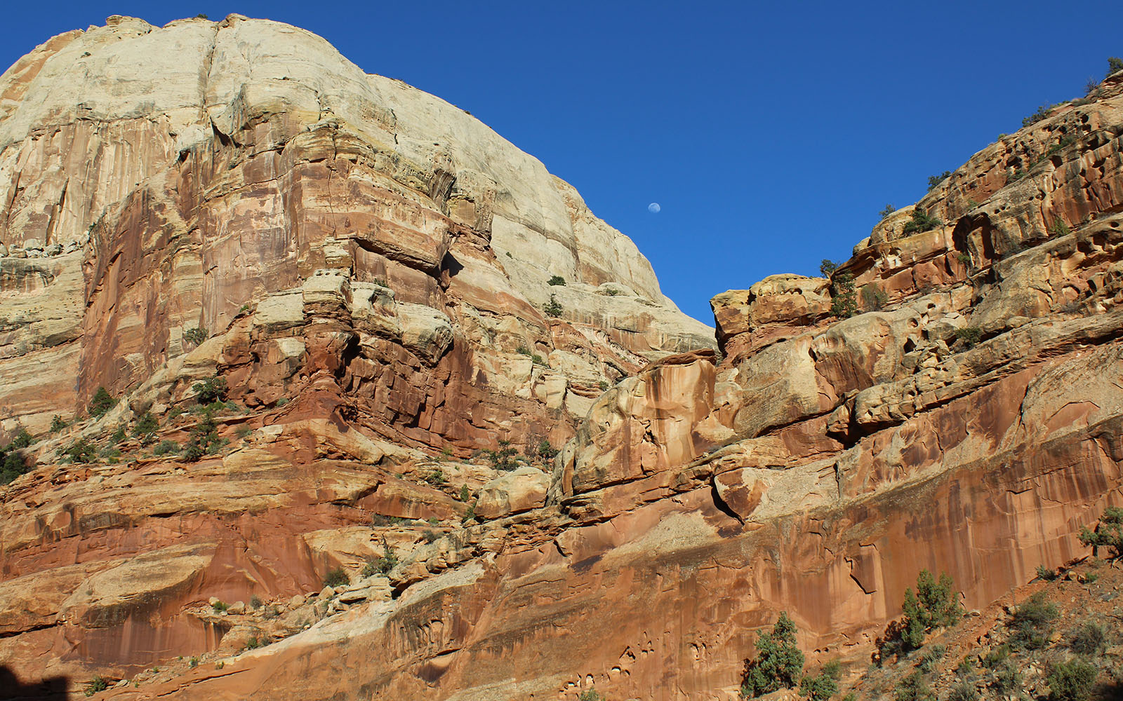 Capitol Gorge trail, at the end of the scenic drive, is an easy trail that brings you to some pioneer graffiti. You don’t need to continue the trail as it climbs to the waterpockets. Sunset Point is another short and easy three-quarter-mile trail to a panoramic viewpoint.