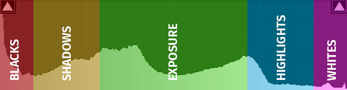 Histograms in Lightroom and Adobe’s Camera Raw are broken up into five main sections — blacks, shadows, exposure, highlights, and whites. Some cameras and image editing programs divide it a little differently — shadows, mid-tones, and highlights, or blacks, quarter tones, mid-tones, and highlights. There is no standard for these divisions and the idea is the same.