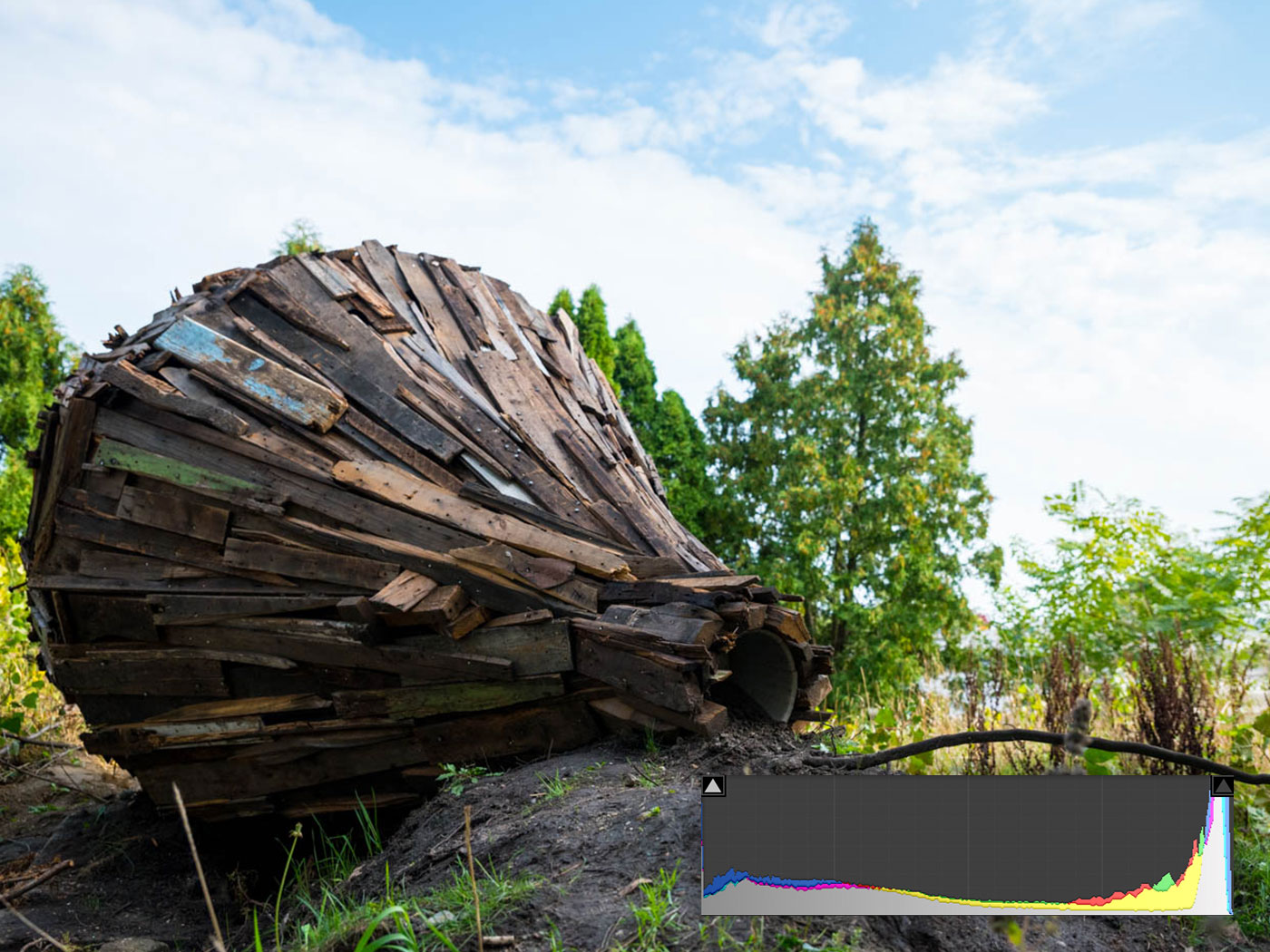 A large mountain on the right side of the histogram, suggests that the image might be over-exposed. In this case, details in the brighter parts of the photograph, the clouds, are missing.