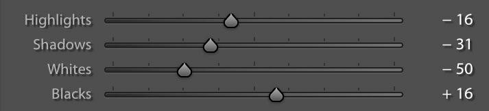 Here’s a trick — in Lightroom, hold down the Shift key and double click on Whites. Do the same for Blacks. The sliders will adjust automatically, increasing the tonal range of your photograph as much as it can. Using this technique on your images will help you lift the shadows and take down the over-highlighted areas of your photograph. This is the first thing I do for every photograph, as it allows me to see the most amount of detail that I can.