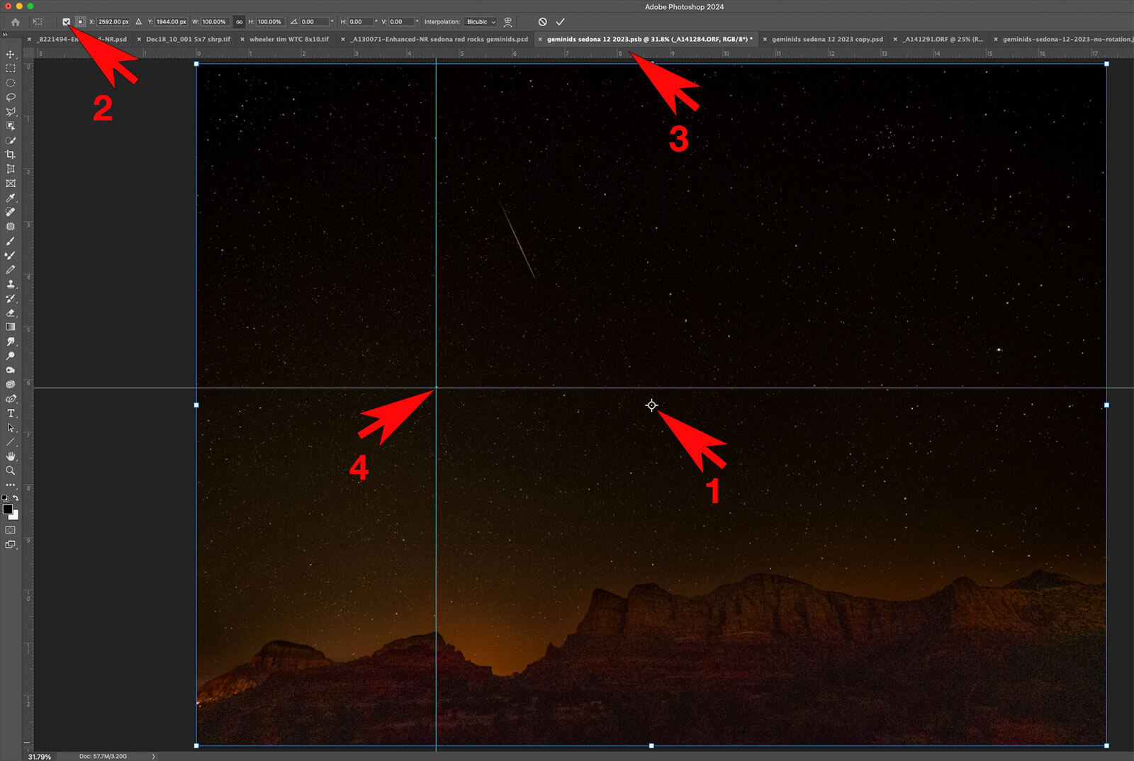 Here are some tips for making the lining up of the images easier. Start at the bottom layer and as before Option + Click on the eyeball to turn off all other layers visibility. Take two guides and place a horizontal and vertical over Polaris. Turn on layer two. Invert the mask to reveal most of the layer. Change the Blend Mode of the layer to Difference. Activate the Transform Tool. Press Cmd + T or Ctrl + T on PC. Move the rotation point from the center of the image to the point over Polaris. Rotate the layer until most of the stars disappear. In this case, I looked for the Big Dipper to line up. Accept the transformation. Invert the mask and change the Blend Mode back to Normal. Repeat for the rest of the layers. If you don’t see the rotation point for the Transform Tool in the top left-hand corner, there is a check box that will turn it on and off.