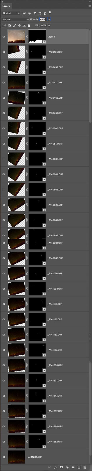 I selected images with meteors in Adobe Bridge. Next, I went to Tools > Photoshop > Load Files into Photoshop Layers to stack the files into layers. The master image was chosen and moved to the bottom of the stack. Option + Click on the bottom layer eyeball to turn off all other layers. Click on the eyeball of the second layer to turn it on. Add a Mask. Using a Paint Brush set to 100% Black remove the meteor. Making a brush just a little larger than your meteor click at one end, hold down the Shift key and click at the opposite end of the meteor. Holding the Shift key ensures a perfectly straight line between the two points. Finesse your mask selection and invert the mask. Voila! The meteor is now visible. Repeat these steps for the rest of the layers.