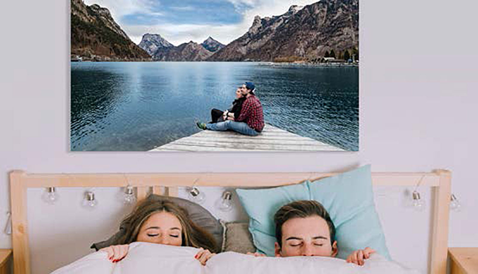 A large photo above your bed can instantly create the atmosphere you want for this intimate space. With a photo subject and color palette that fit the feeling of your bedroom, you make it your personal sanctuary. Choose a print size that is 2/3 the width of your bed, generally with a minimum width of 45 inches (approx. 120 centimeters).