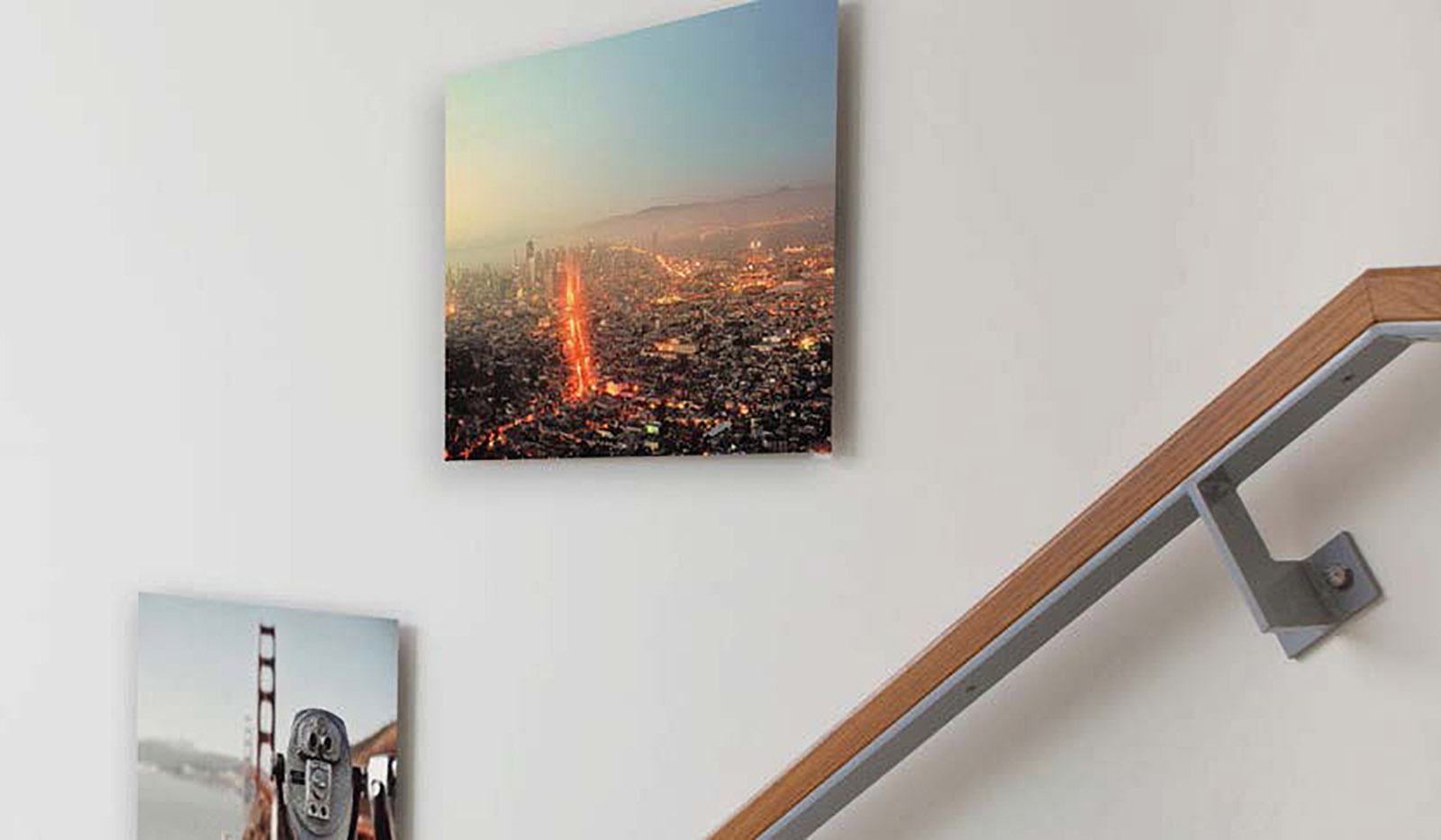 To create a roomy feeling in your hallway or staircase, we suggest hanging several smaller-sized wall-prints. Not only will your space feel bigger, but you’ll be able to show off more than one great photo. Choose photos with a common color or theme to create a simple, modern look.